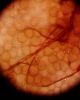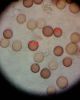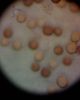 Šis bij pārsteigums. Ievācu bez cerībām, jo sakaltis. Hipotēze par gļotsēni, jo gļotaina apmale. Tā kā balts, sporu nebūs, neko zaudēt nevar, ielēju kastītē ūdeni (pat ne salvetes, vnk "dzīvu ūdeni") un aizmirsu. Krāmējoties pa kastītēm, atveru un - pārsteigums. Plānotā gļotsēne izaugusi 100x lielāka :D un izrādās sēne, kas mitrumā beidzot uzbriedusi. Kā tādu mikroskopēt, gan nezinu, jo tur tak receklis.. Tā ka vai pēdējie 2 mikro-foto par tēmu - nezinu.