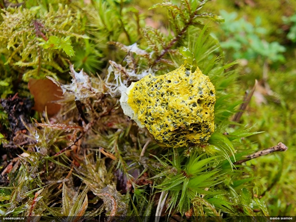 Šis ļoti interesants. Sporas ļoti traumētas, bet tām, kas ir veselas, ir diezgan skaidrs raksts, kas neatbilst nekam no man zināmiem ragansviestiem vai pumpurītēm (pat neņemot vērā izmēru), bet tīri labi atbilst baltapaļajai krāterītei, kas tā nevar būt, jo parauga "ciešais kamoliņš" ir stipri lielāks par tādu. Sporas pēc izmēra varētu atbilst Fuligo licentii, bet no dzeltenā te ir stipri maz. Ja vienīgi ir kāds nobriedušāka attēls, kas rāda, ka ir bijis dzeltens, bet no ilgas stāvēšanas izbalējis.