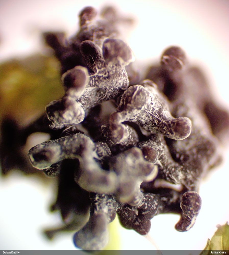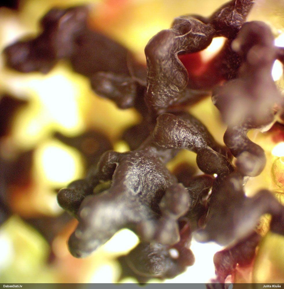 Paldies par paraugu! Paraugā augļķermeņi gan bija ļoti cieti, līdz galam nenobrieduši. Jauna eksemplāra krāsa var būt nozīmīga noteikšanā, bet svarīgi arī nobriedināt (turot mitrākā vietā), citādi perīdiju noņemt mikroskopēšanai ir praktiski neiespējami. Šajā gadījumā mazu gabaliņu izdevās atmiekšķēt un nodabūt, kas sarežģītākos gadījumos varētu būt nepietiekami. Pēc izmēra un perīdija pazīmēm te varētu būt divi varianti L.irregularis un L.epidendrum, kas esot viens no grūtāk atšķiramajiem sugu pāriem. L.epidendrum vairāk raksturīgi, kā es tos saucu, pārstaipi uz augļķermeņa virsmas, kas te ir ļoti labi redzami, tāpēc izšķīros par parastāko sugu.