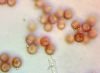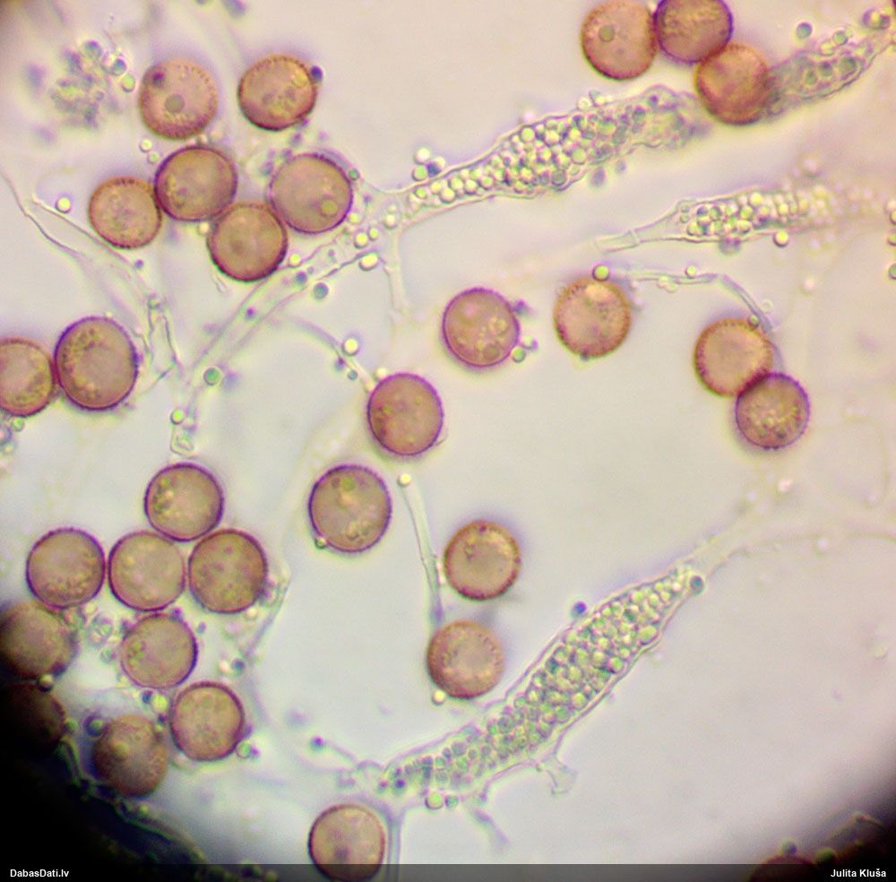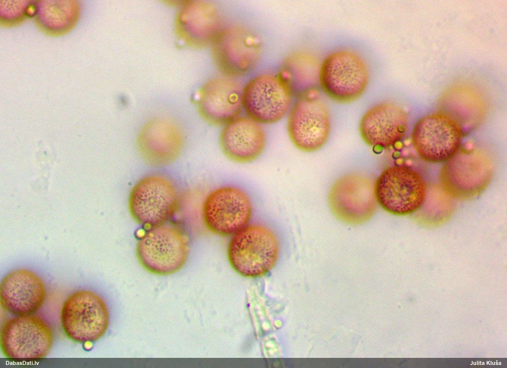 Žēl, ka te nav pielikts mērogs, kā mērīts. Bet ja nepilnīgi nobriedis (par ko liecinātu “iesprūšana” dzelteni-zaļganajā stadijā), tad sporas var izskatīties arī lielākas, nekā vajadzētu