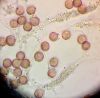 Ko pēc mikroskopētā var secināt: * sporas ir tumšas, tātad ir cukurīšu (Didymiaceae) vai pumpurīšu dzimta (Physaraceae) * sporas ir gan plusmīnus apaļas, gan garenas, gan vēl visādi izlocītas, tātad paraugs nav pilnvērtīgi nobriedis, jo normāli sporām jābūt visām līdzīgas formas, katrā ziņā vismaz pret vienu asi simetriskām. Ja ir nepilnvērtīgi nobriedis paraugs, tad sporu izmēram jāņem mazākās simetriskākās sporas. Šajā gadījumā normāli būtu jābūt apaļām sporām, tāpēc garenajām nevajadzētu mērīt pa garāko diametru. Labāk pamaklēt iespējami apaļākās sporas. * Ja sporas ir deformētas, tad mērījumus vajag veikt vairākkārtīgi, nu vismaz 3 reizes, vai nu tajā pašā mikroskopijā vēl arī pavisam citā vietā, vai labāk pavisam jaunu porciju sporu paņemt no tā paša (ja maz augļķermeņu) vai vēl labāk no kāda hipotētiski labāk nobrieduša augļķwermeņa. Tad varēs labāk nojaust, cik varētu būt normālu sporu diametrs, resp., vai visos gadījumos ir līdzīgi izmēri, vai arī tie ļoti "lēkā", tad jāskatās, kurā gadījumā bija normālākās (tipiski arī mazākās) sporas. * Pēc attēlā ar mērījumiem redzamā es secinātu, ka sporu izmērs orientējoši ir 12-13 mkm. Sporām vērts mērīt (secināt) ar precizitāti līdz 0,5 mkm, lielākai "precizitātei" nav jēgas, jo tur nāk klāt arī mērījuma kļūda. Tomēr te ir tikai viens mērījums dažām redzamām sporām, tāpēc droši pateikt nevar. * Tumšsporainajām ļoti svarīgs ir sporu raksts, kuru var palaimēties nomanīt arī nepilnīgi nobriedušām sporām, kas reizēm "glābj", ja sporu izmēru precīzi grūti pateikt. Ļoti nenobriedušām sporām diemžēl arī raksts mēdz būt nenobriedis. Konkrētajā gadījumā, ja tiešām būtu jāizšķiras starp Physarum psittacinum un Diderma tigrinum (es patiesībā cerētu vispār uz jaunu sugu Latvijai), tad būtu jāsaskata, vai ir vienmērīgi izvietotas kārpas (Diderma tigrinum) vai kārpas ar tumšāku kārpu grupām (Physarum psittacinum). Mikroskopijā es kārpas īsti neredzu vispār, tāpēc man ir jautājums, vai tas ir tāpēc, ka sporas pagalam nenobriedušas (it kā tik traki nevajadzētu būt) vai arī mikroskopijā nav pareizi fokusēts (vajag fokusēt šauri uz sporas centru, lai redz rakstiņu) Attiecīgi par sporu rakstu es neko nevaru pateikt. * kapilīcijs gļotsēņu "pamatu" noteikšanai (kāda dzimta, ģints) ir pats svarīgākais. Ja nav kapilīcija, tad var noteikt tikai dažos izņēmuma gadījumos (lielākoties vienkāršos, vai ja ir liela pieredze). Sporas var izskatīties identiskas arī dažādu dzimtu gļotsēnēm. Lai tiktu pie kapilīcija, sarežģītākos gadījumos uz stikliņa jāņem iespējami viss augļķermenis un, tā kā tas var būt "biezs", tad to starp stikliņiem "izsmērē" tiktāl, lai sāk atsegties (mikroskopijā kļūst redzamas) iekšējās struktūras. Jāredz vismaz kaut kādas daļas, krāsa. Ja tā būtu olīte (Diderma), tad kapilīcijs būtu skaidri brūni-balti pavedieni. Ja tā ir pumpurīte (Physarum), tad pavedieni ir caurspīdīgi un var būt ļoti grūti saskatāmi. Tad jāmeklē kapilīcija mezgli, kas ir apaļu kaļķa granulu sakopojumi. Ja paraugs kārtīgi tiek "izsmērēts" tad tie mezgli arī var "izsmērēties", tad vnk redz, ka paraugs pilns ar apaļām kaļķa granulām (tās redzamas arī šajā mikroskopijā). Vispār apaļas kaļķa granulas ir arī olītēm (uz galviņas), tāpēc pašas par sevi tās neliecina vienas vai otras dzimtas virzienā. Pumpurītēm (Physarum) parasti kapilīciju (t.i., tā mezglus) saskata mazos palielinājumos mikroskopā, vēl neliekot paraugu starp stikliņiem. Tikai jābūt atsegtām iekšējām struktūrām. Tad redz, ka ir tādi kaļķa sakopojumi iekšpusē. Gala secinājumi no tā, kas jau ir redzams - paraugs ir nepilnīgi nobriedis, kas pēc sporu izmēriem vairāk atbilstu Diderma tigrinum (vajag 10-13µm, bet redzamās 12-13µm nepilnīgi nobriedušām sporām ir ļoti atbilstošas), taču olītēm kapilīcijam būtu jābūt vieglāk ievērojamam, tomēr tā te nav. Priekš Physarum psittacinum sporas ir stipri par lielu, ar tādām novirzēm sugu noteikti nevarētu apstiprināt, turklāt būtu jāsaskata tumšāku kārpu grupas. Bet es nepavisam negribētu apstāties pie šīm divām hipotēzēm, kurām biotops īsti neatbilst. Varbūt ir kāda mums mazāk zināma ģints, tāpēc ļoti labprāt saņemtu paraudziņu 28. martā. Tik gari rakstu arī priekš sevis, jo grāmatai man svarīgi saprast, ko iesācējam (un ne tikai) svarīgi izskaidrot, lai tiktu līdz rezultātam. Visi "parastie" noteicēji ir gadījumiem, ja ir visas sastāvdaļas zināmas, un kapilīcijs ir visupirmais.