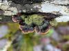 Šis varētu būt tāds piemērs, kad sāk dzīvi uz koksnes un tad uzplešas virsū sūnai. Man izskatās, ka šai vajadzētu būt rufai, nu tāds sarkans. Pat divi perīdiji 2. foto no apakšas tīri pārliecinoši - dzeltenais plānais un tad pa virsu malā var redzēt tumšo.