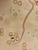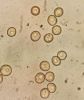 Šis bij pārsteigums. Ievācu bez cerībām, jo sakaltis. Hipotēze par gļotsēni, jo gļotaina apmale. Tā kā balts, sporu nebūs, neko zaudēt nevar, ielēju kastītē ūdeni (pat ne salvetes, vnk "dzīvu ūdeni") un aizmirsu. Krāmējoties pa kastītēm, atveru un - pārsteigums. Plānotā gļotsēne izaugusi 100x lielāka :D un izrādās sēne, kas mitrumā beidzot uzbriedusi. Kā tādu mikroskopēt, gan nezinu, jo tur tak receklis.. Tā ka vai pēdējie 2 mikro-foto par tēmu - nezinu.
