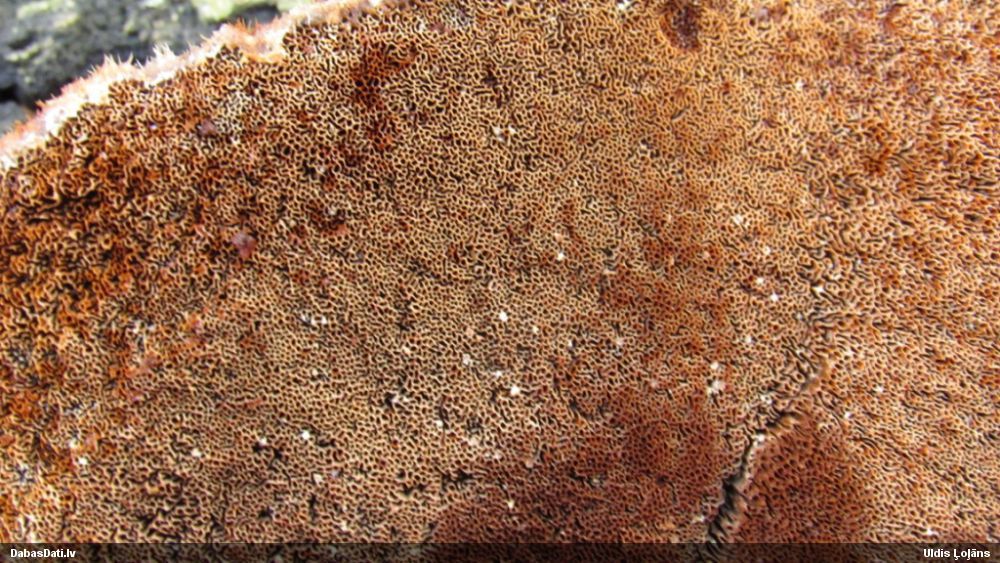 Vismaz vienai bildei mikroskopijā vajadzētu pielikt kādu mērogu, lai var saprast, kā mērīts, un samērīt, ja kas pietrūkst. O.persimile tipiski uz eglēm neaug, tāpēc pētu, vai nav noteikšanas kļūda. O.favogineum aug uz eglēm, tai mikroskopijā svarīga pazīme ir elateru platums, kas pārsniedz 6 mkm. Te elateras izskatās platas, bet "uz aci" noteikt platumu grūti. Vizuāli jau baigi medaino neatgādina, bet tur jau arī krustojumi iespējami. ja aug uz egles, tad gribas saprast, kāpēc.