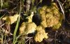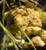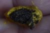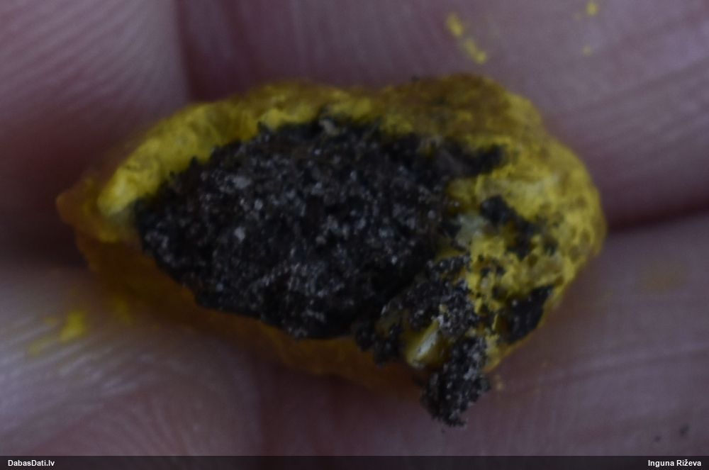 Šis ļoti interesants. Sporas ļoti traumētas, bet tām, kas ir veselas, ir diezgan skaidrs raksts, kas neatbilst nekam no man zināmiem ragansviestiem vai pumpurītēm (pat neņemot vērā izmēru), bet tīri labi atbilst baltapaļajai krāterītei, kas tā nevar būt, jo parauga "ciešais kamoliņš" ir stipri lielāks par tādu. Sporas pēc izmēra varētu atbilst Fuligo licentii, bet no dzeltenā te ir stipri maz. Ja vienīgi ir kāds nobriedušāka attēls, kas rāda, ka ir bijis dzeltens, bet no ilgas stāvēšanas izbalējis.