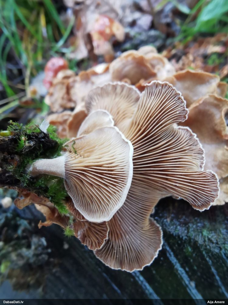 Rūtiņa ir 1mm, par kājiņu es arī nevaru saprast - drīzāk nav nekā ir :) Nobriedušas ir netīri pelēkbaltas ar ļoti trauslu perīdiju. Pagaidām daivās neplaisā, grūti pateikt, kā plaisā, ja nepieskaras augļķermeņiem. "Kraukšķīgs perīdijs", tas ir kā? Pie mazākā pieskāriena tas saplīst gabaliņos, bet vai kraukšķ? :) Sarkans nav, iekšpuse perīdijam balta, bet pskatīšos vēl.