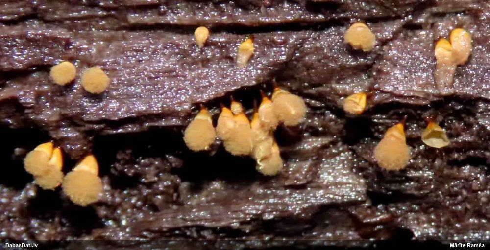 Jā, būtu jauki, ņemot vērā, ka nu jau skaidrāk iezīmējas, uz kā meklēt, un manējais atradums nemaz nebija vēl riktīgi izsporojies, lai arī nobriedis, tā ka arī domāju, ka noteikti cerības vēl ir. Pat šķita, ka manā gadījumā bija arī jaunāki eksemplāri, bet tad atkal sašaubījos, vai tie nav caurspīdīgi-baltgani sveķu pilieni. Ja ir pa vienam gab., tad pārliecība dabā nepavisam nav liela. Varbūt svarīgākais ir ne egles dzīvīgums, bet micēlijs, kas radies uz sveķiem, kas, savukārt, rodas no dzīvām eglēm. Tādā gadījumā drošs fakts ir tikai tas, ka eglei ir jābūt bijušai dzīvai :D. Līdzīgi esmu atradusi arī zeltpūšļu pilienīti Hemitrichia sordivesiculosa, kas raksturīgi aug uz dzīviem lapukokiem, bet es to atradu uz nesen lūzušas apses kritalas. "Dzīva vai nesen dzīva" - varbūt tā var saukt to vajadzīgo statusu.