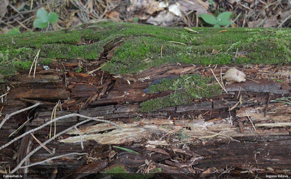 Satrūdējusi kritala mežā, nav dēļi. Iespējams, egle, jauktu koku mežs.
