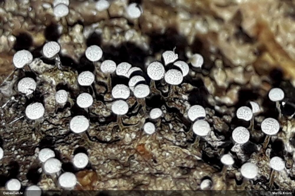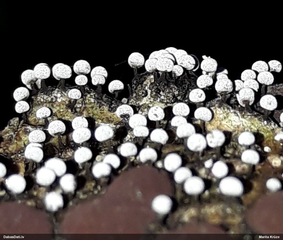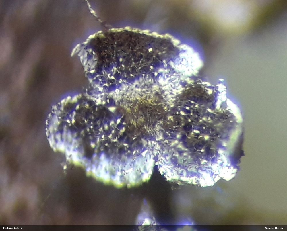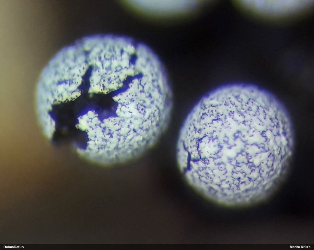 Paldies, Raivo! Ar acu gaišumu man arvien sliktāk, bet mikroskops palīdz. Jā, gribēju teikt, ka paraugam, ja vien nav kāda jutīga atradne, kurai drīkst ievākt tikai mazu gabaliņu, vērts ievākt lielāku gabalu, jo gļotsēnēm patīk kompānija. Un mikroskopa mazajos palielinājumos ar sānu papildus apgaismojumu ir vērts rūpīgi "izstaigāt" visu paraugu. Arī ķērpjus un interesantas sīksēnītes tā var atrast, ko dabā nepamanītu. Ar kriksītēm ir dažādi - pirmās es tā arī tikai citu sugu paraugos pamanīju, bet vēlāk redzēju arī dabā kriskīšu plantācijas - ja to ir daudz, tad var pamanīt jau dabā. Uz sūnām gan ir ekstrēms gadījums, dabā droši nepamanītu, arī eksemplāra noņemšana no sūnas nebija pārāk veiksmīga, tāpēc par noteikšanu mazliet šaubos (sporām mazliet cits tonis). Bet pagaidām citas hipotēzes nav (un konkrētā eksemplāra arī vairs ne).
