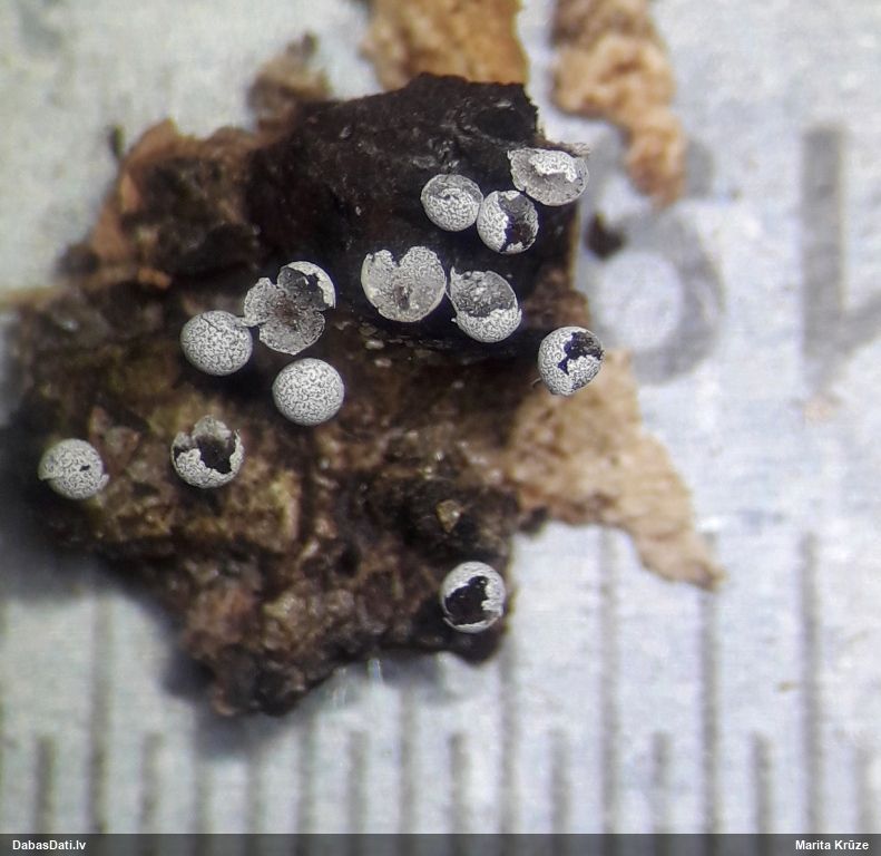 Nevar saprast, uz kā auga - vai tas ir nobirās, vai uz kritalas mizas? Abas hipotēzes ir "pa tēmu", bet man "nepatīk" kopskats, kur skaidri redzams, ka vairāki augļķermeņi ir cieši kopā, bet tas nav raksturīgs ne vienai, ne otrai hipotēzei, kur augļķermeņi tipiski ir nodalīti. Ļoti interesanti, ja ir paraugs, tad kāds tas izskatās tagad, un vispār to vajadzētu mikroskopēt.