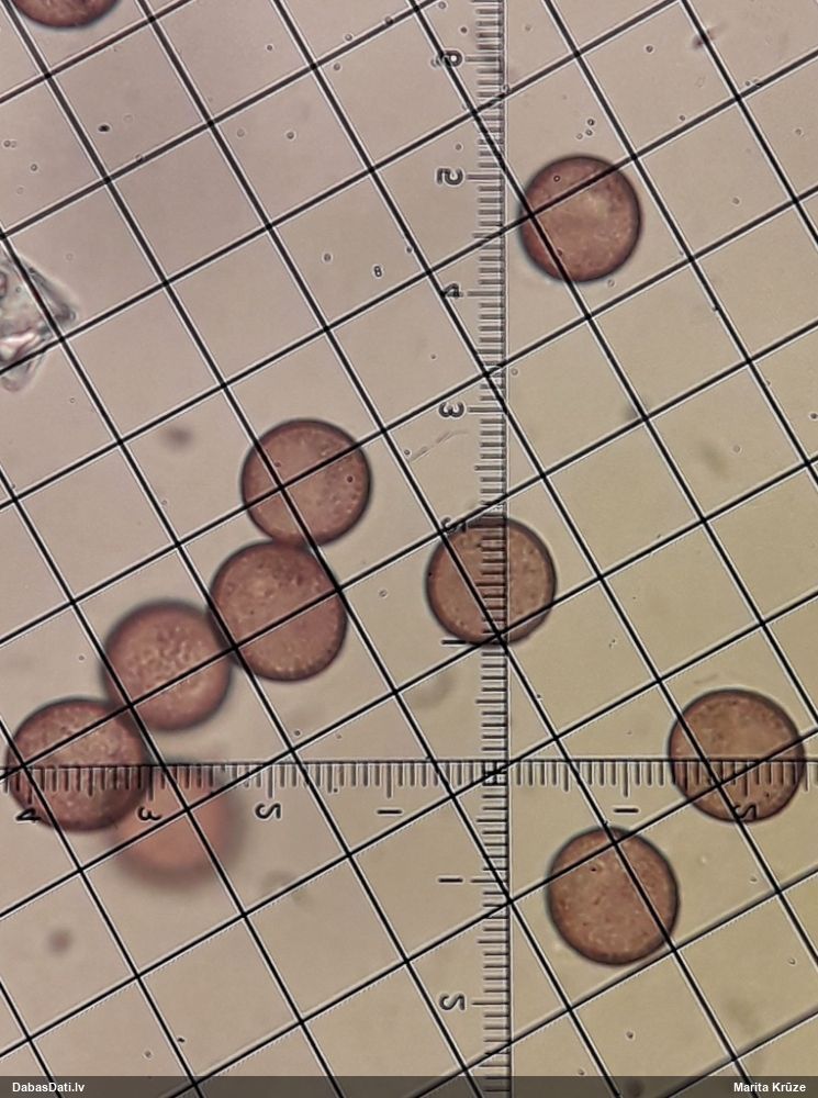 Žēl, ka te nav pielikts mērogs, kā mērīts. Bet ja nepilnīgi nobriedis (par ko liecinātu “iesprūšana” dzelteni-zaļganajā stadijā), tad sporas var izskatīties arī lielākas, nekā vajadzētu