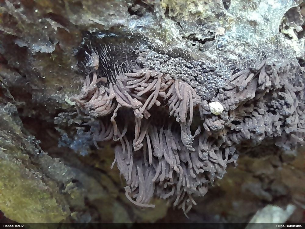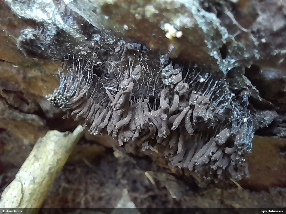 Paldies par paraugu! Paraugā augļķermeņi gan bija ļoti cieti, līdz galam nenobrieduši. Jauna eksemplāra krāsa var būt nozīmīga noteikšanā, bet svarīgi arī nobriedināt (turot mitrākā vietā), citādi perīdiju noņemt mikroskopēšanai ir praktiski neiespējami. Šajā gadījumā mazu gabaliņu izdevās atmiekšķēt un nodabūt, kas sarežģītākos gadījumos varētu būt nepietiekami. Pēc izmēra un perīdija pazīmēm te varētu būt divi varianti L.irregularis un L.epidendrum, kas esot viens no grūtāk atšķiramajiem sugu pāriem. L.epidendrum vairāk raksturīgi, kā es tos saucu, pārstaipi uz augļķermeņa virsmas, kas te ir ļoti labi redzami, tāpēc izšķīros par parastāko sugu.