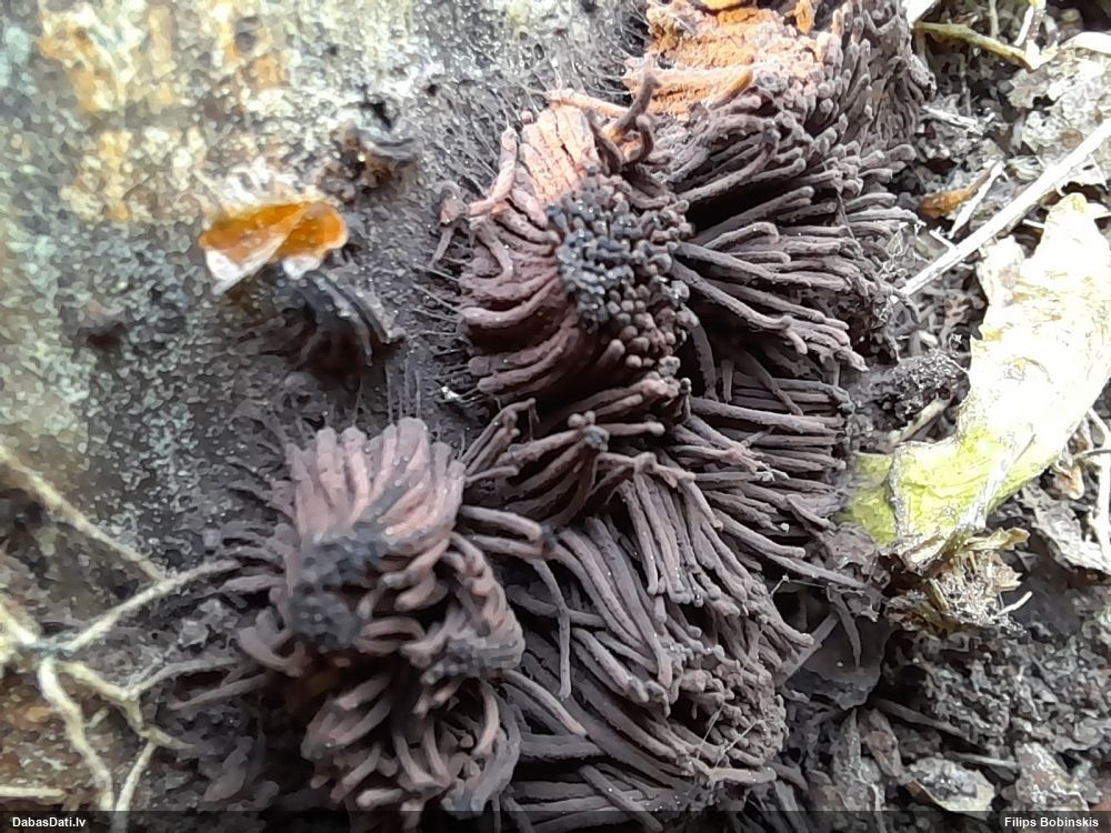 Pārlasīju un secināju, ka pašā sākumā neesmu bijusi precīza - runa bija par brūnām (ne tumšām) sporām un tādas var būt arī cilindrīšu dzimtā, bet cilindrīšu dzimtas gļotsēnes ir bez tādām apaļām kaļķa granulām, kādas redzamas mikroskopijā, tāpēc šo dzimtu var izslēgt.