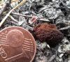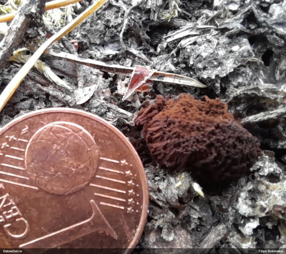 Šis interesants. Uz sausām priedes kritalām rozā mazi līdzīga izskata augļķermeņi maijā aug divām citādi atšķirīgām sugām (dažādās dzimtās) - melnajai plaispikai Amaurochaete atra un trauslajam gļotpūpēdim Reticularia jurana. Pēc sīkām mikropazīmēm (foto nav redzama pat ne sīka balta pakāje ap augļķermeni, un uz virsmas ar lielu piepūli var ja ne saskatīt, tad iztēloties tīklotu virsmas rakstu) izšķīros par biežāko no abām - melno plaispiku, kas tipiski aug samērā atklātās, skrajās vietās, t.sk. nesenos izcirtumos.