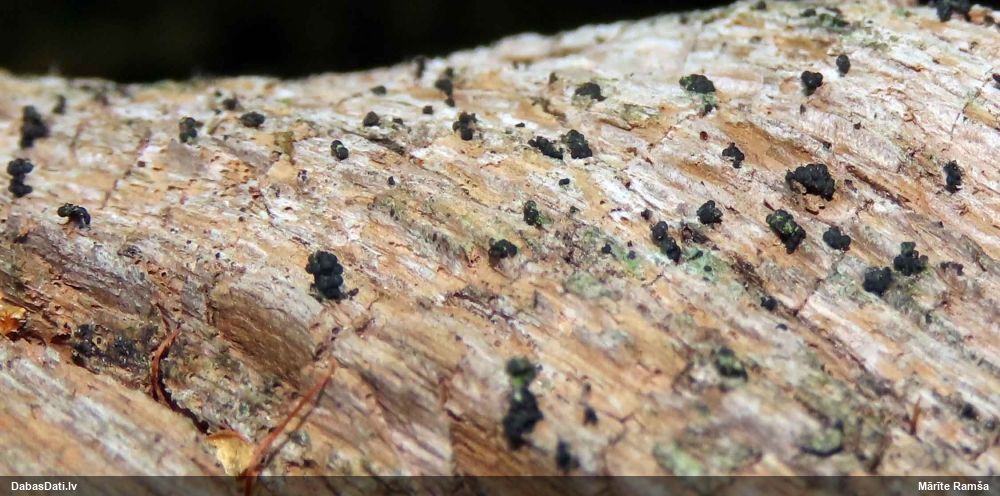 Šis interesants. Uz sausām priedes kritalām rozā mazi līdzīga izskata augļķermeņi maijā aug divām citādi atšķirīgām sugām (dažādās dzimtās) - melnajai plaispikai Amaurochaete atra un trauslajam gļotpūpēdim Reticularia jurana. Pēc sīkām mikropazīmēm (foto nav redzama pat ne sīka balta pakāje ap augļķermeni, un uz virsmas ar lielu piepūli var ja ne saskatīt, tad iztēloties tīklotu virsmas rakstu) izšķīros par biežāko no abām - melno plaispiku, kas tipiski aug samērā atklātās, skrajās vietās, t.sk. nesenos izcirtumos.