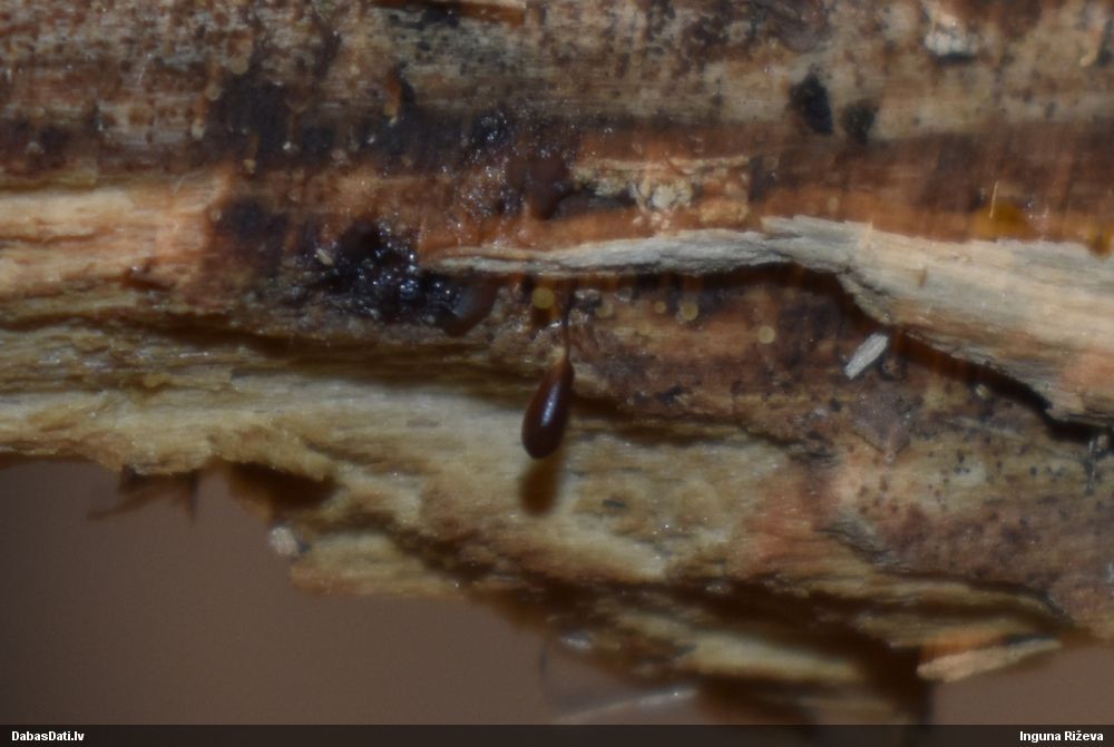 Domāju to Sorocybe resinae, ja tā, tad esmu soli tuvāk mērķim, nu zinu, kā izskatās un kur meklēt. Gļotsēnītes klāt gan nebija.