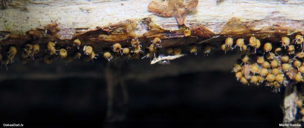 Paldies, Raivo! Ar acu gaišumu man arvien sliktāk, bet mikroskops palīdz. Jā, gribēju teikt, ka paraugam, ja vien nav kāda jutīga atradne, kurai drīkst ievākt tikai mazu gabaliņu, vērts ievākt lielāku gabalu, jo gļotsēnēm patīk kompānija. Un mikroskopa mazajos palielinājumos ar sānu papildus apgaismojumu ir vērts rūpīgi "izstaigāt" visu paraugu. Arī ķērpjus un interesantas sīksēnītes tā var atrast, ko dabā nepamanītu. Ar kriksītēm ir dažādi - pirmās es tā arī tikai citu sugu paraugos pamanīju, bet vēlāk redzēju arī dabā kriskīšu plantācijas - ja to ir daudz, tad var pamanīt jau dabā. Uz sūnām gan ir ekstrēms gadījums, dabā droši nepamanītu, arī eksemplāra noņemšana no sūnas nebija pārāk veiksmīga, tāpēc par noteikšanu mazliet šaubos (sporām mazliet cits tonis). Bet pagaidām citas hipotēzes nav (un konkrētā eksemplāra arī vairs ne).