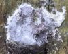 Šis ļoti interesants. Sporas ļoti traumētas, bet tām, kas ir veselas, ir diezgan skaidrs raksts, kas neatbilst nekam no man zināmiem ragansviestiem vai pumpurītēm (pat neņemot vērā izmēru), bet tīri labi atbilst baltapaļajai krāterītei, kas tā nevar būt, jo parauga "ciešais kamoliņš" ir stipri lielāks par tādu. Sporas pēc izmēra varētu atbilst Fuligo licentii, bet no dzeltenā te ir stipri maz. Ja vienīgi ir kāds nobriedušāka attēls, kas rāda, ka ir bijis dzeltens, bet no ilgas stāvēšanas izbalējis.