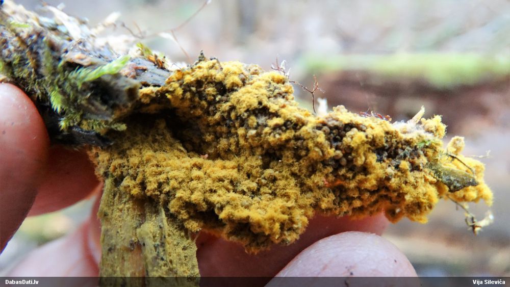 Nevar saprast, uz kā auga - vai tas ir nobirās, vai uz kritalas mizas? Abas hipotēzes ir "pa tēmu", bet man "nepatīk" kopskats, kur skaidri redzams, ka vairāki augļķermeņi ir cieši kopā, bet tas nav raksturīgs ne vienai, ne otrai hipotēzei, kur augļķermeņi tipiski ir nodalīti. Ļoti interesanti, ja ir paraugs, tad kāds tas izskatās tagad, un vispār to vajadzētu mikroskopēt.
