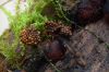 Man pēkšņi radās ideja - vai tur bija nu ļoti mitrs mikroklimats, egle ar melnalksni? Hipotētiski tādas dzeltenas var būt Diachea muscorum. Te bilde ir mazliet līdzīga: https://fr.wikipedia.org/wiki/Fichier:Craterium_muscorum,_Trawscoed,_North_Wales,_Aug_2016_-_Flickr_-_janetgraham84.jpg