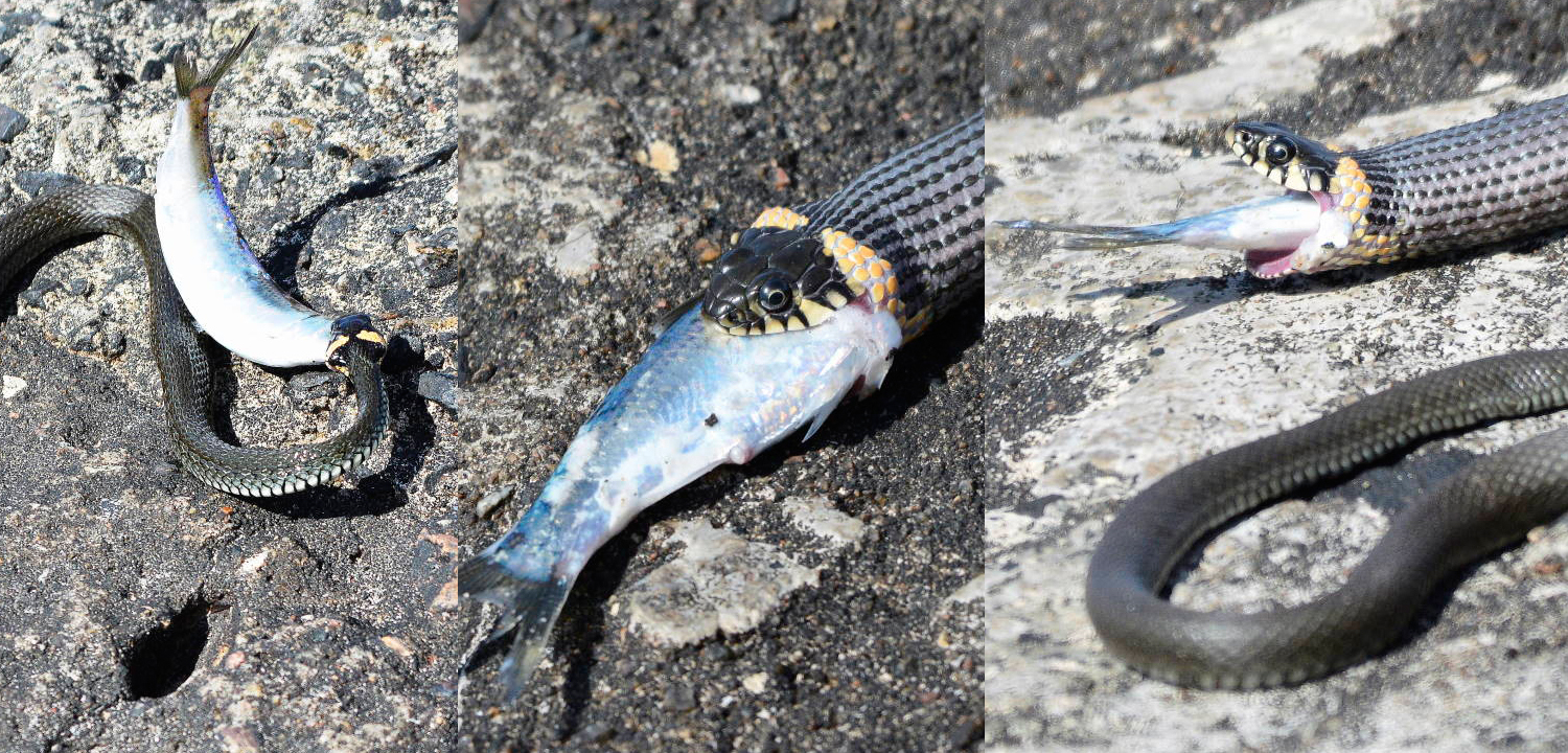 Zalktis Natrix natrix ar reņģi Clupea harengus mutē. Foto: Igors Deņisovs