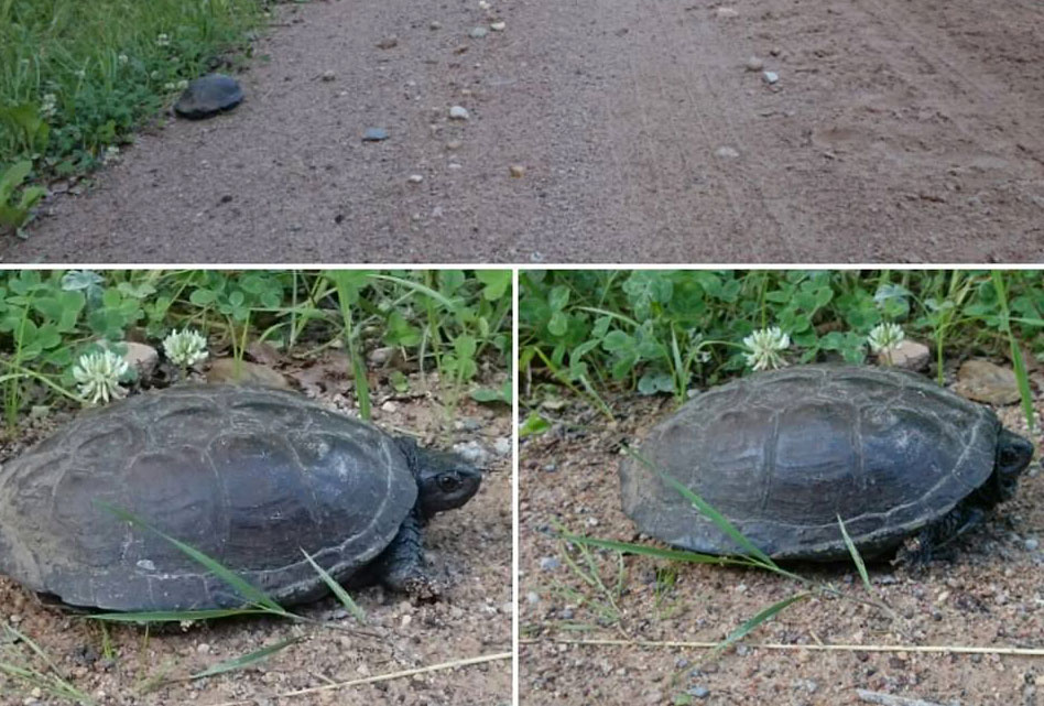 Linda: "Rāpoja lēni gar ceļa malu uz ezera pusi. Piestāja, apskatīja. Bruņas bija plaukstas lielumā. Kamēr piegāja mašīnā paņemt foto, diezgan jau bija parāpojis."