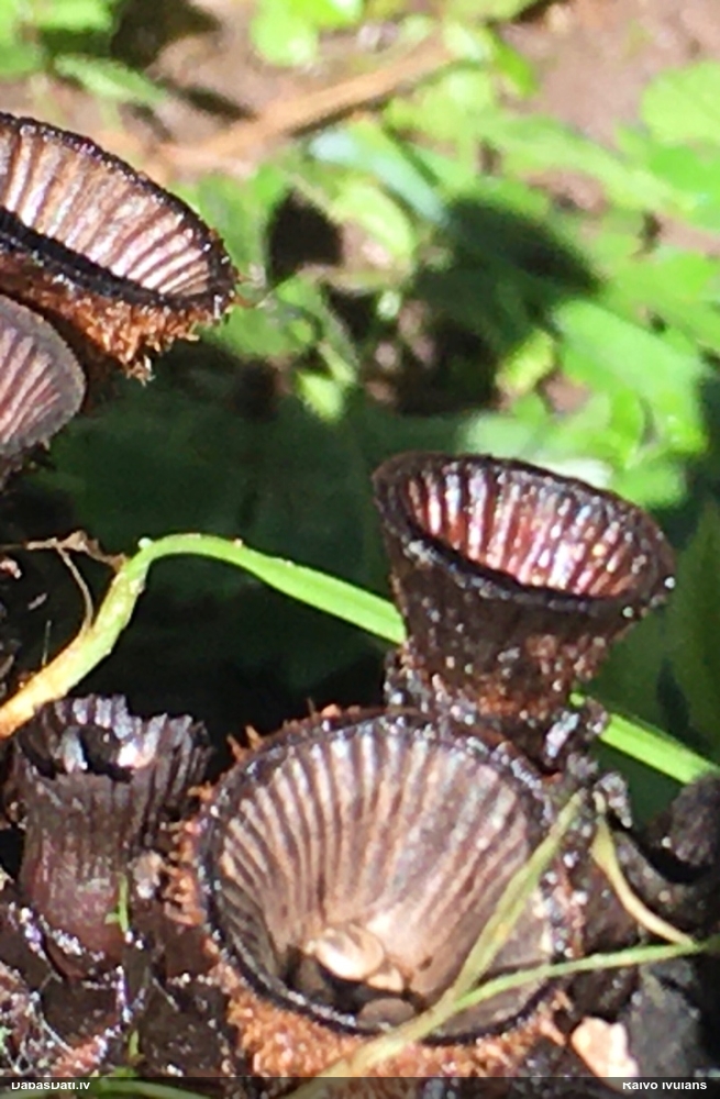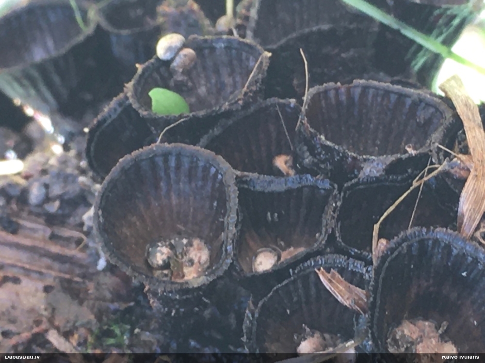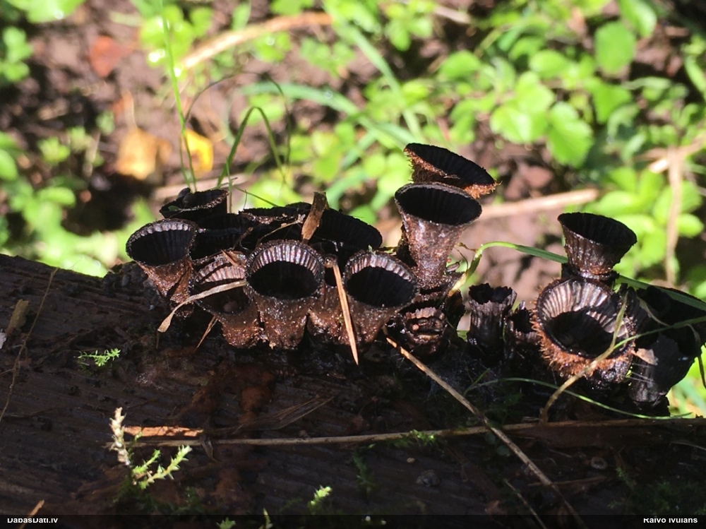 Šis interesants. Uz sausām priedes kritalām rozā mazi līdzīga izskata augļķermeņi maijā aug divām citādi atšķirīgām sugām (dažādās dzimtās) - melnajai plaispikai Amaurochaete atra un trauslajam gļotpūpēdim Reticularia jurana. Pēc sīkām mikropazīmēm (foto nav redzama pat ne sīka balta pakāje ap augļķermeni, un uz virsmas ar lielu piepūli var ja ne saskatīt, tad iztēloties tīklotu virsmas rakstu) izšķīros par biežāko no abām - melno plaispiku, kas tipiski aug samērā atklātās, skrajās vietās, t.sk. nesenos izcirtumos.