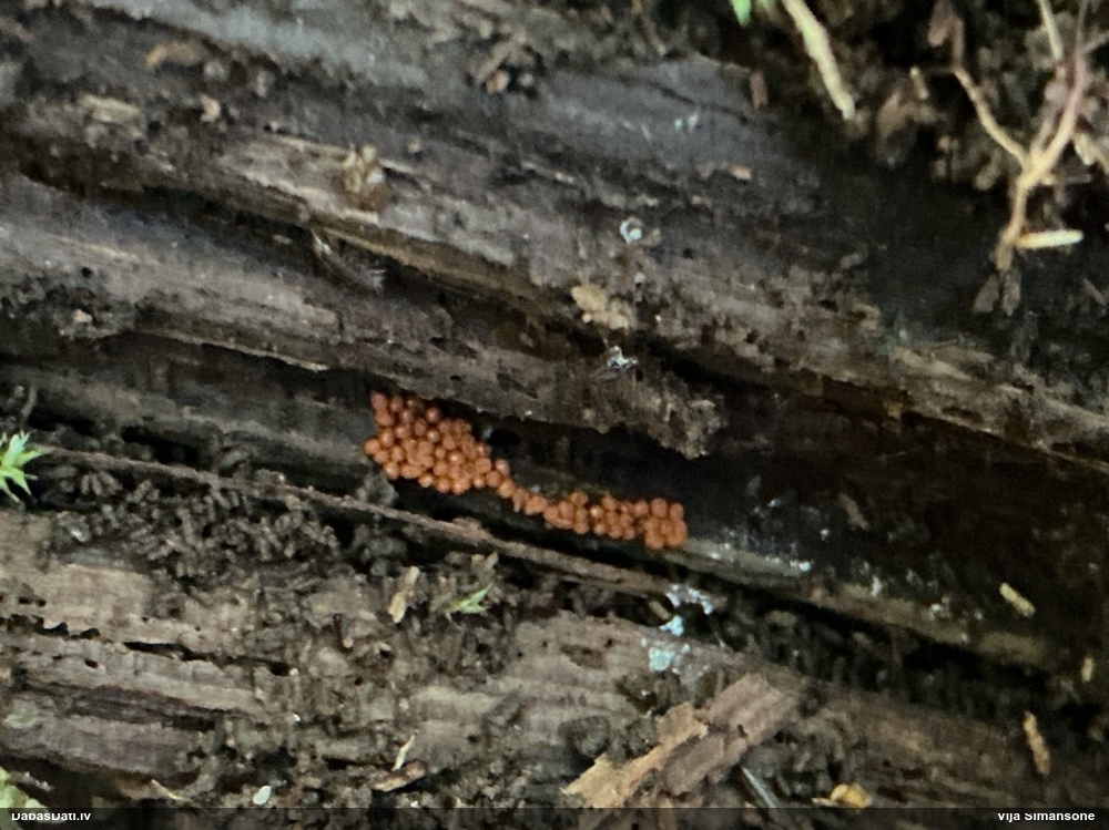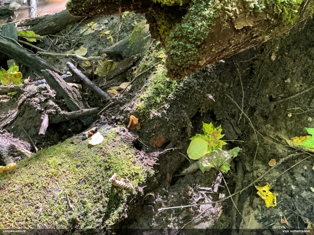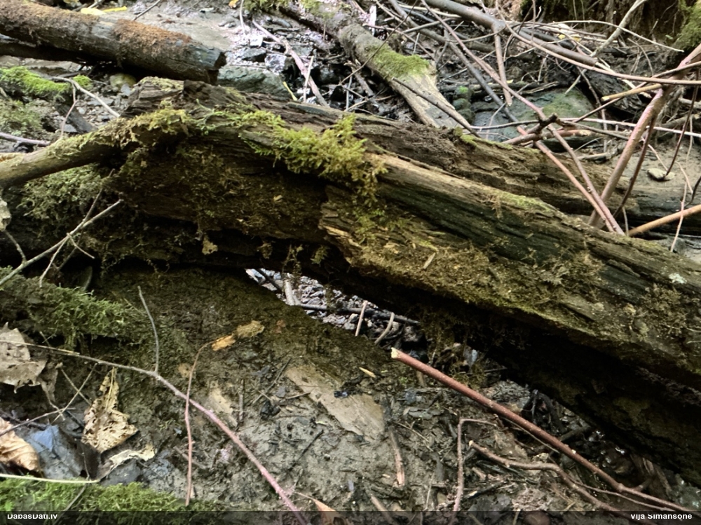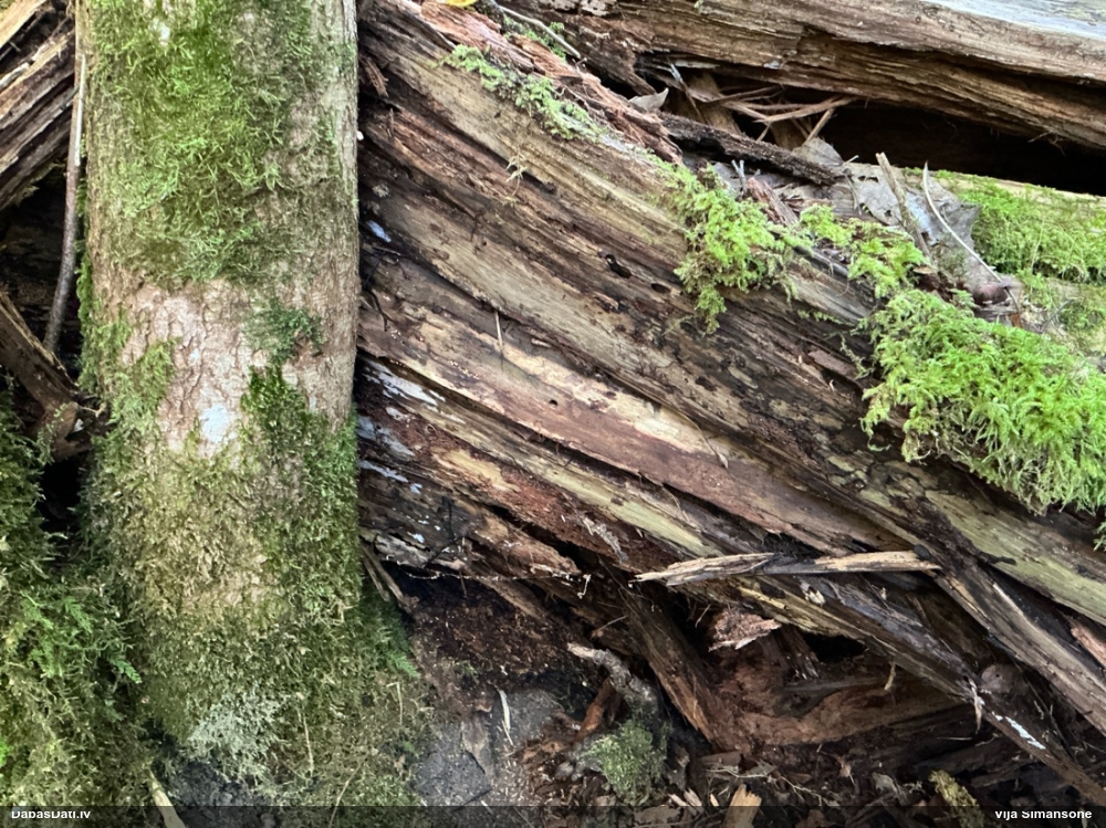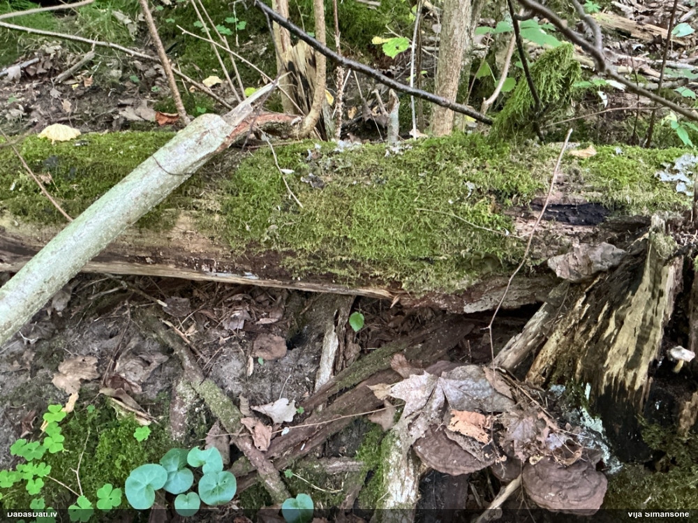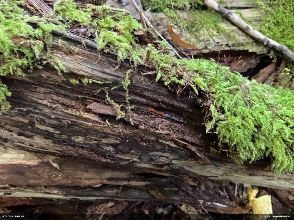 Satrūdējusi kritala mežā, nav dēļi. Iespējams, egle, jauktu koku mežs.