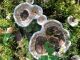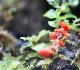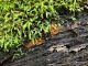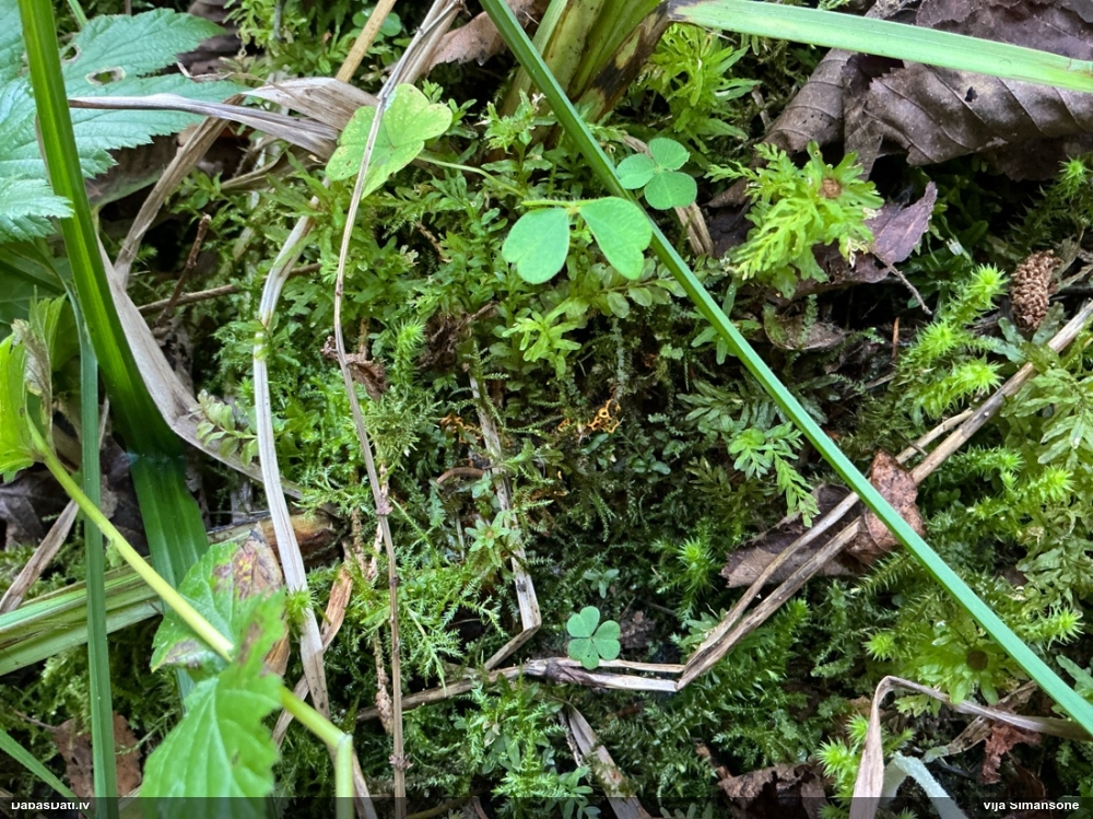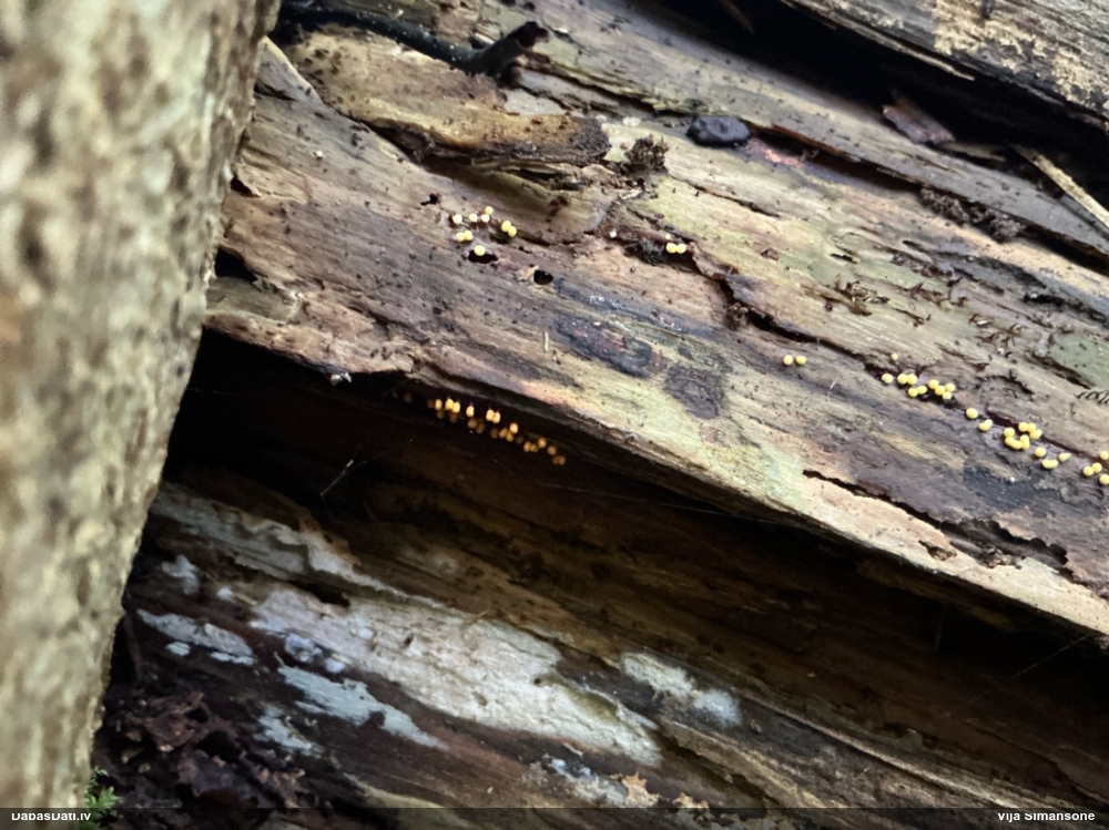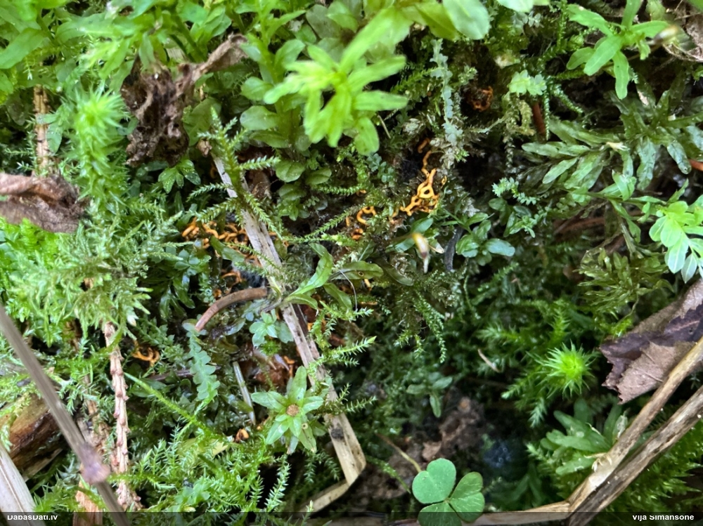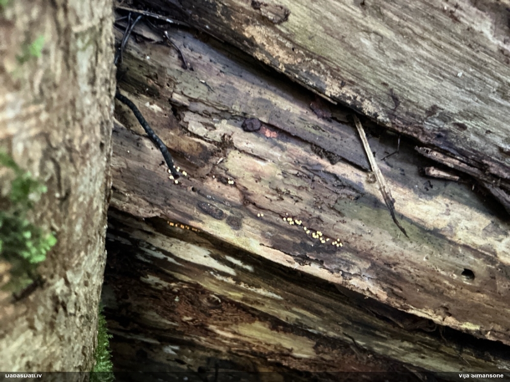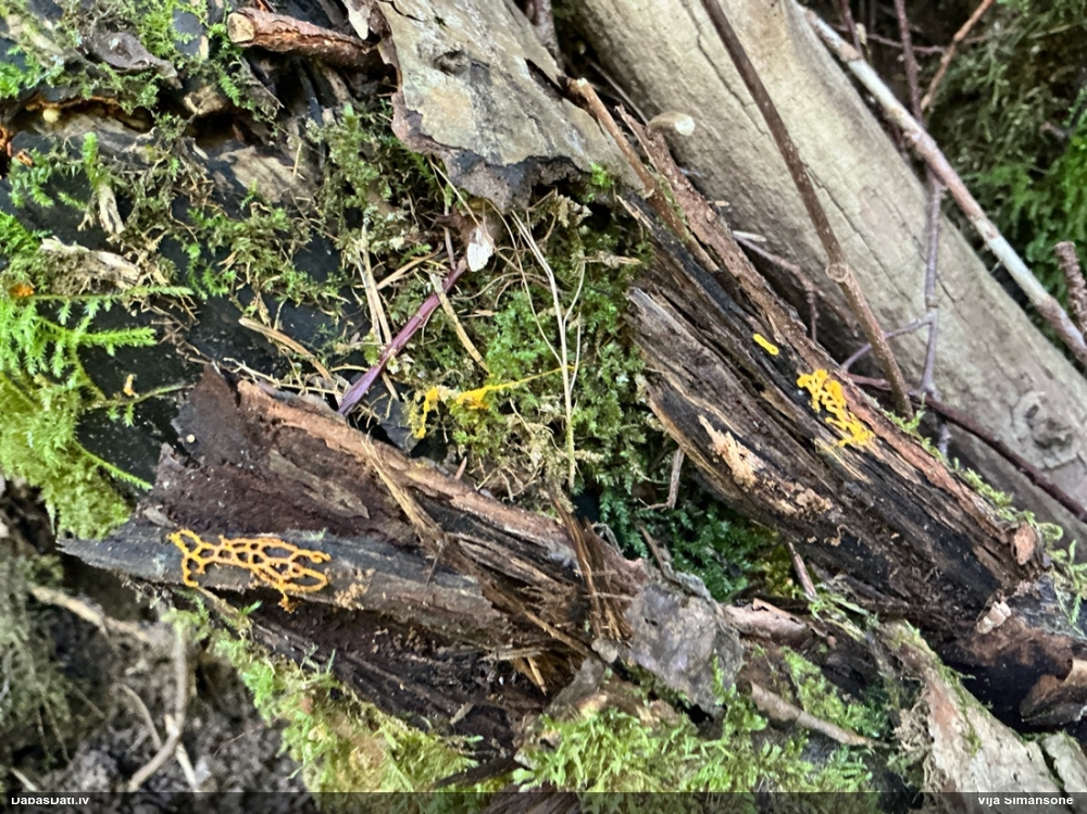 Man pēkšņi radās ideja - vai tur bija nu ļoti mitrs mikroklimats, egle ar melnalksni? Hipotētiski tādas dzeltenas var būt Diachea muscorum. Te bilde ir mazliet līdzīga: https://fr.wikipedia.org/wiki/Fichier:Craterium_muscorum,_Trawscoed,_North_Wales,_Aug_2016_-_Flickr_-_janetgraham84.jpg
