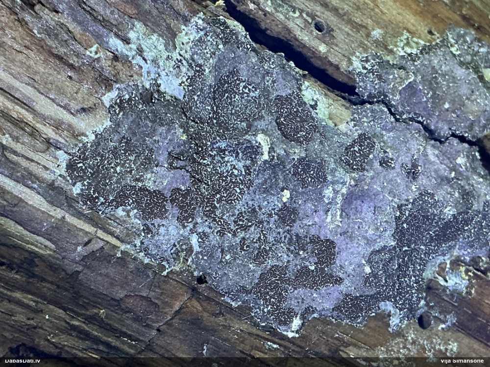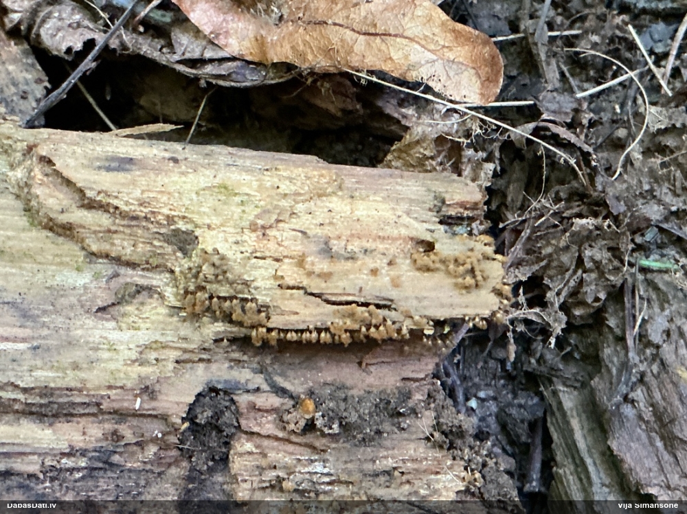 Šobrīd varu iedomāties 2 variantus - melnā plaispika Amaurochaete atra vai parastais gļotpūpēdis Reticularia lycoperdon. Pēc izmēra, augšanas laika un augšanas uz apstrādāta koka atbilst abas.
