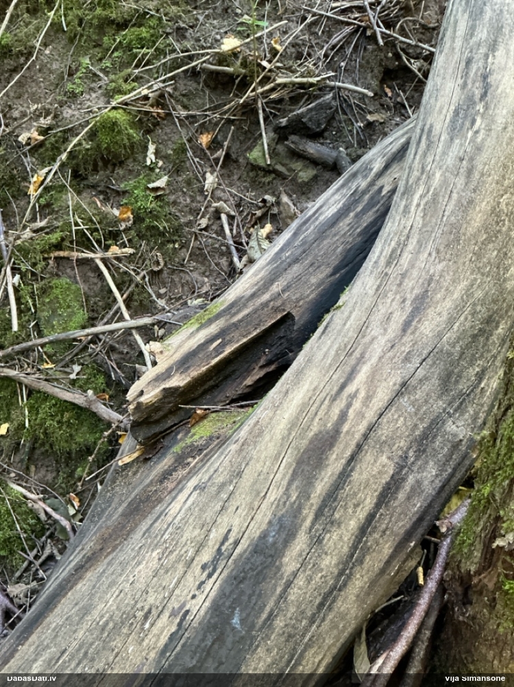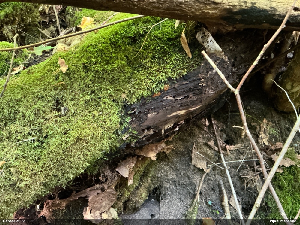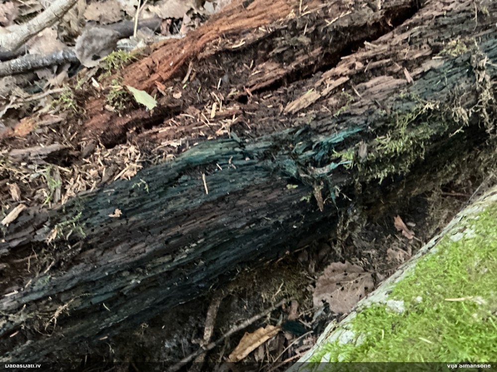 Satrūdējusi kritala mežā, nav dēļi. Iespējams, egle, jauktu koku mežs.