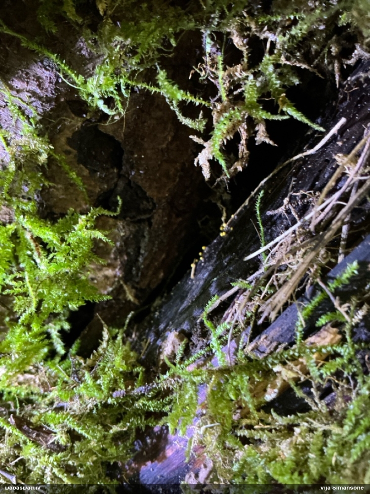 Man pēkšņi radās ideja - vai tur bija nu ļoti mitrs mikroklimats, egle ar melnalksni? Hipotētiski tādas dzeltenas var būt Diachea muscorum. Te bilde ir mazliet līdzīga: https://fr.wikipedia.org/wiki/Fichier:Craterium_muscorum,_Trawscoed,_North_Wales,_Aug_2016_-_Flickr_-_janetgraham84.jpg