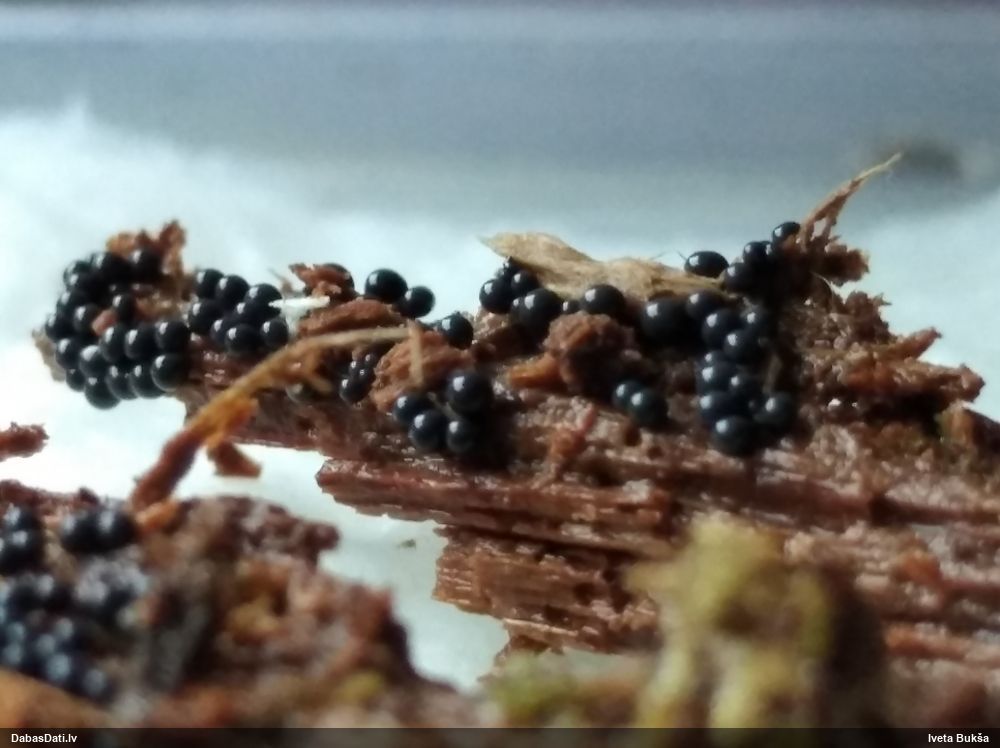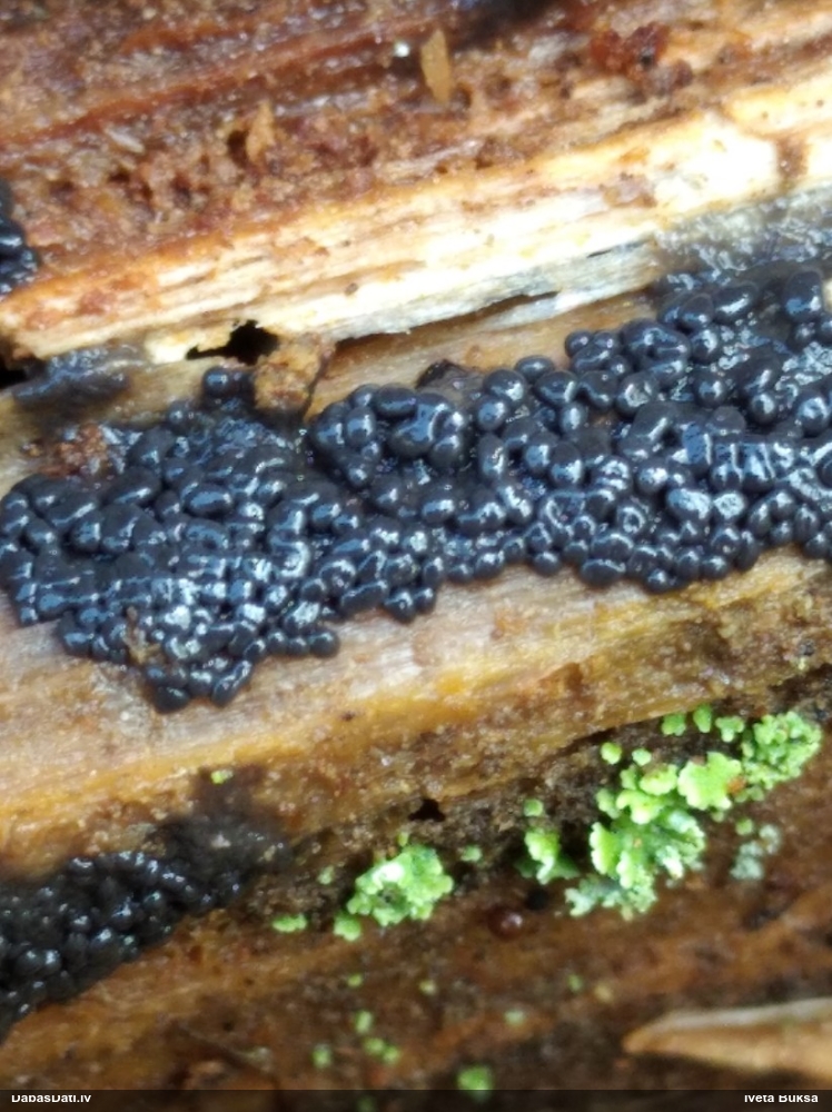 Šobrīd varu iedomāties 2 variantus - melnā plaispika Amaurochaete atra vai parastais gļotpūpēdis Reticularia lycoperdon. Pēc izmēra, augšanas laika un augšanas uz apstrādāta koka atbilst abas.
