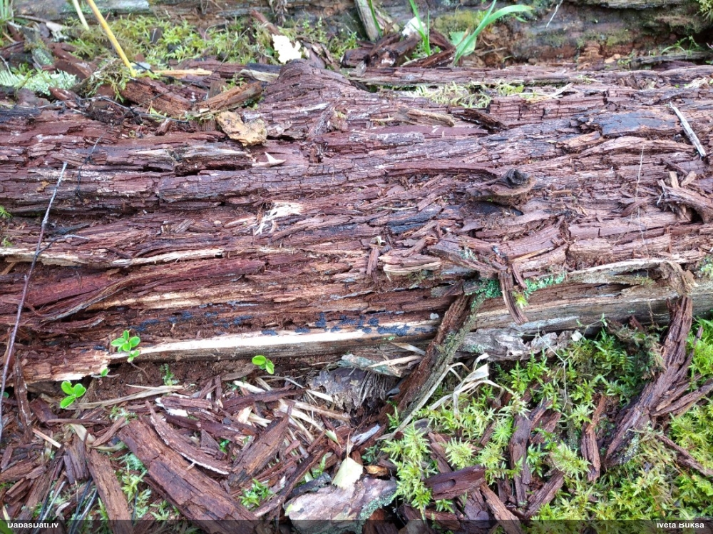 Satrūdējusi kritala mežā, nav dēļi. Iespējams, egle, jauktu koku mežs.