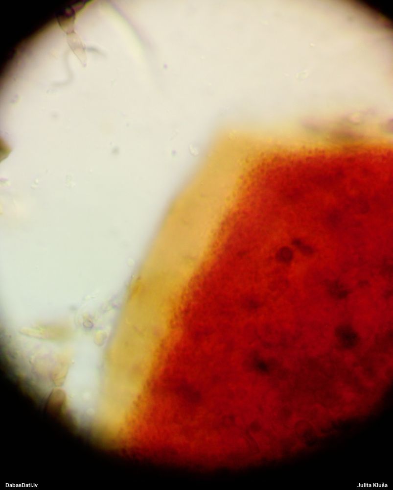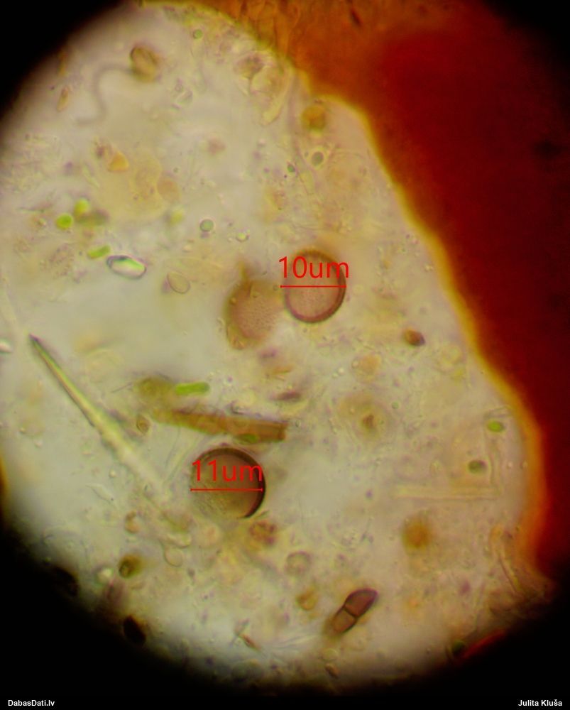 Sporas izskatās ļoti gaišas, varbūt nenobriedušas. Es laikam pēc kāda laiciņa mēģinātu vēlreiz mikroskopēt. Tajā pašā laikā sporu izmēri priekš T.contorta ir pamazi (ja tipiski ir 11-14 mkm, te ir knapi 11 mkm)