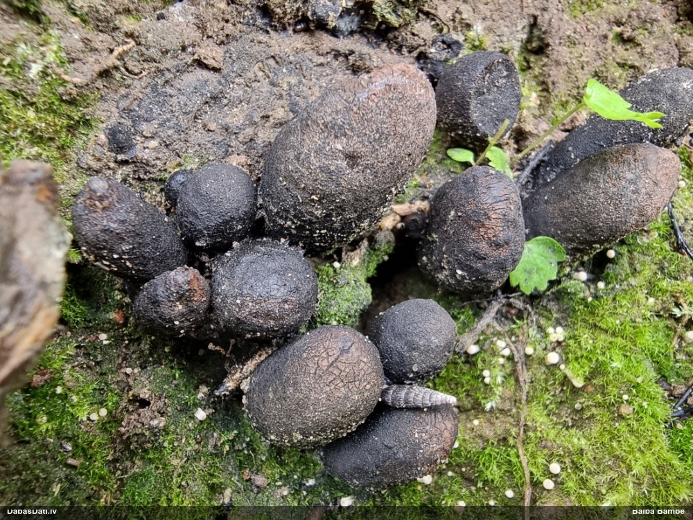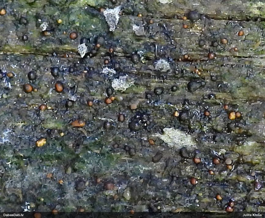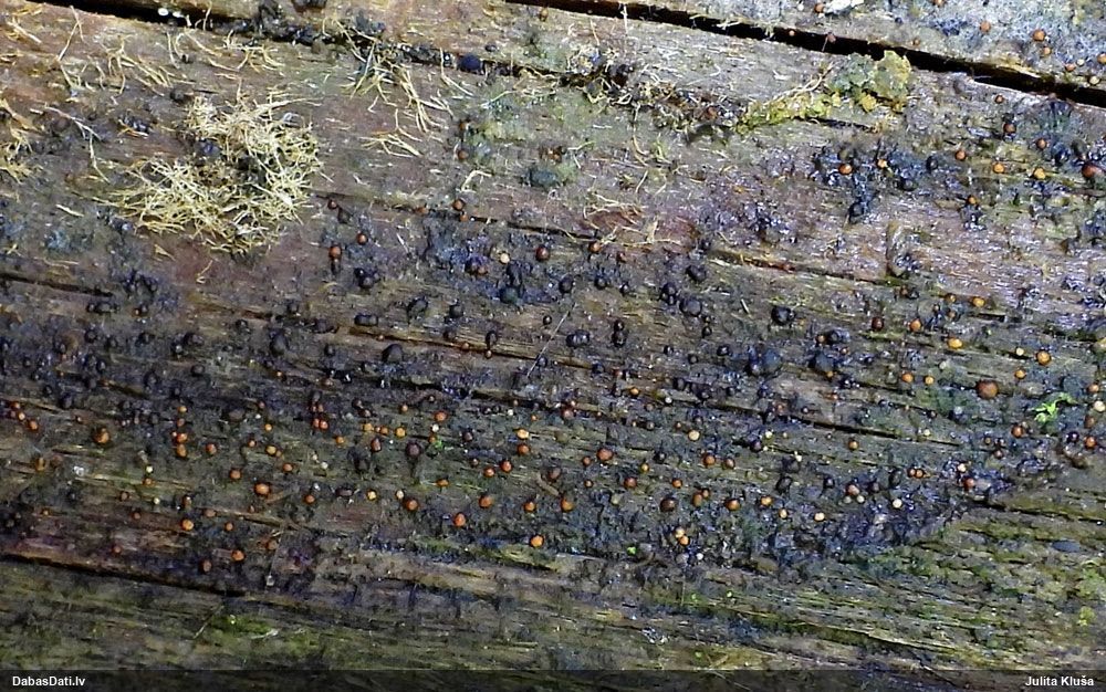 Šobrīd varu iedomāties 2 variantus - melnā plaispika Amaurochaete atra vai parastais gļotpūpēdis Reticularia lycoperdon. Pēc izmēra, augšanas laika un augšanas uz apstrādāta koka atbilst abas.