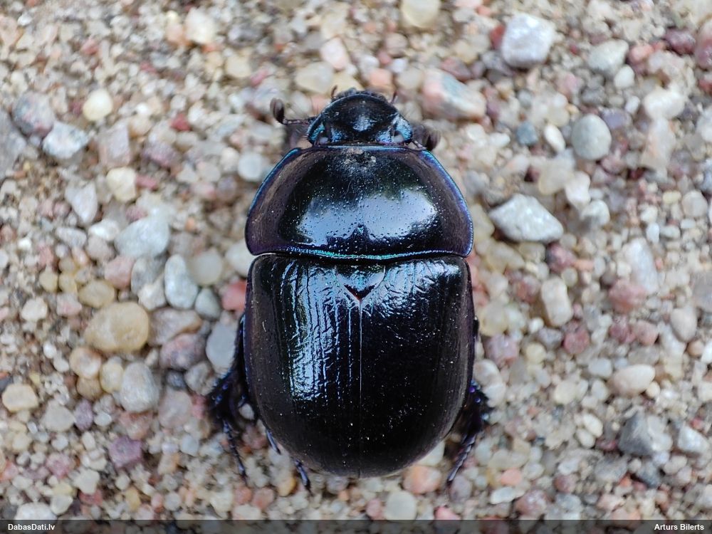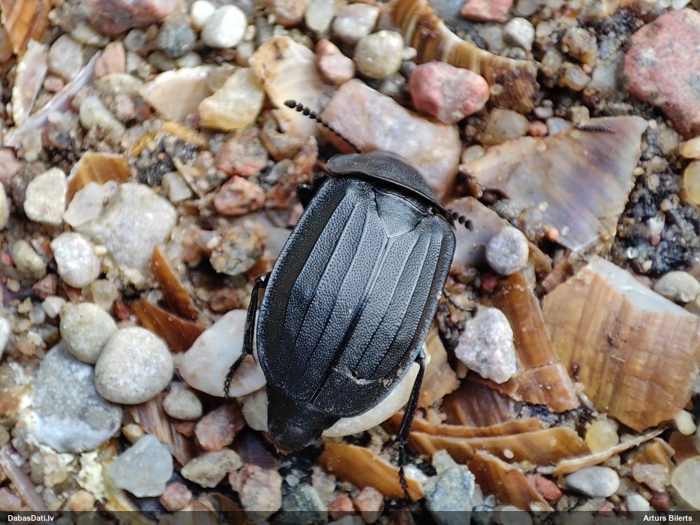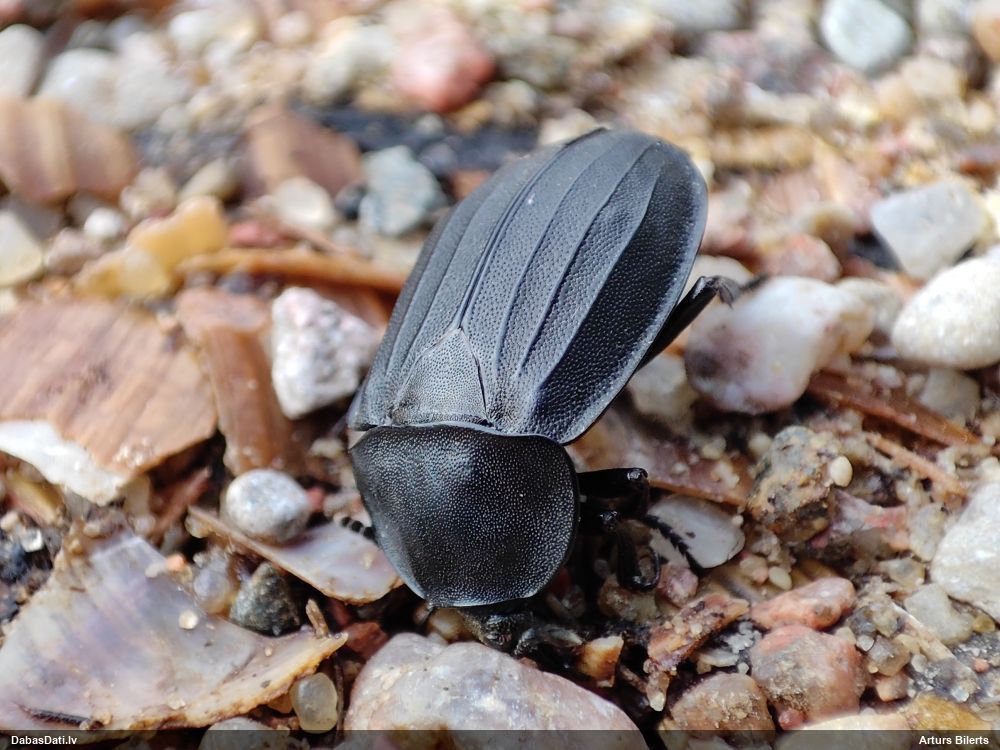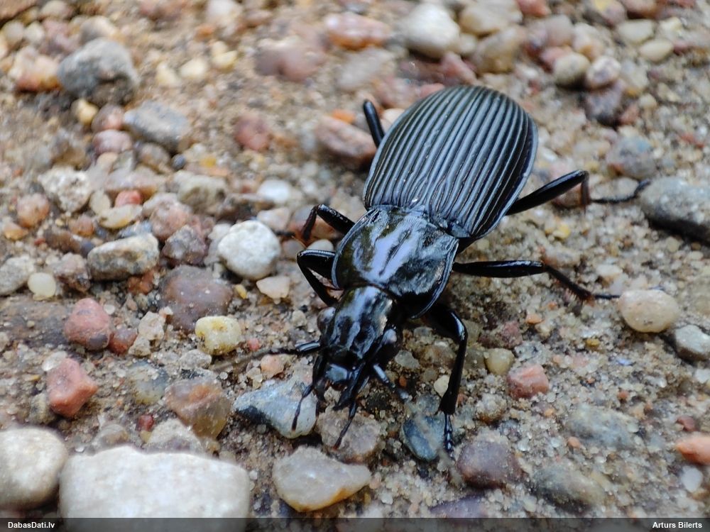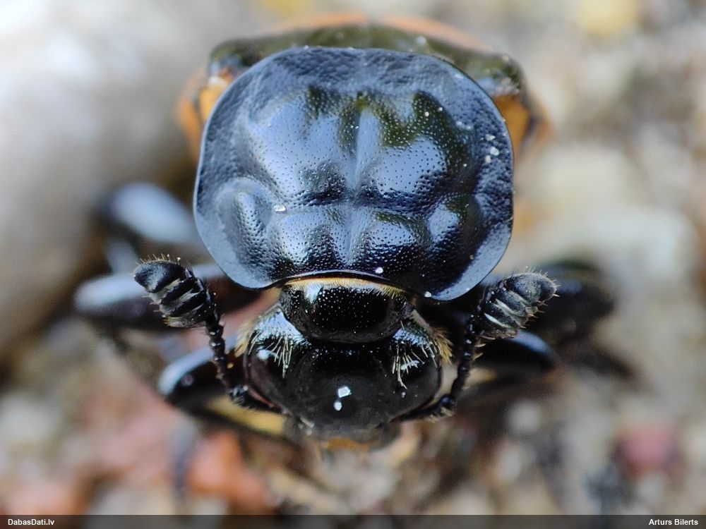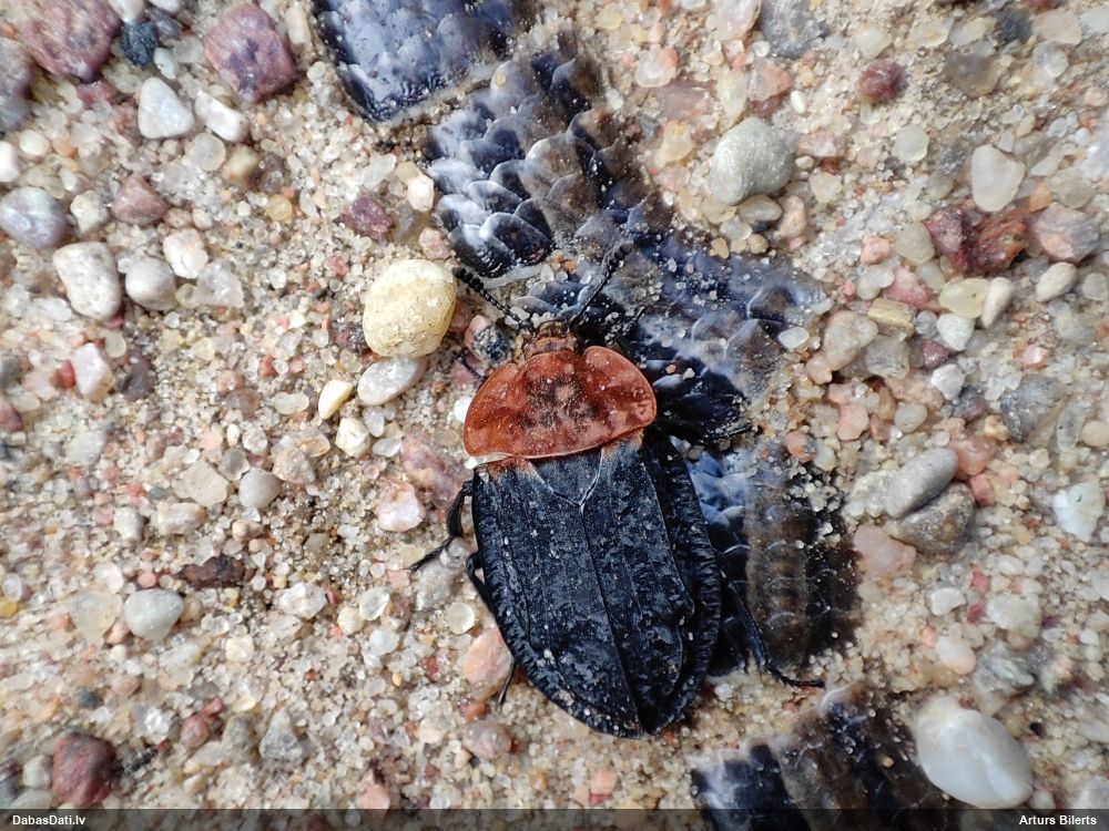 Jāredz tuvāk (kaut vai izkadrēts šis pats attēls) - varbūt tumšā eļļasvabole (Meloe proscarabaeus)