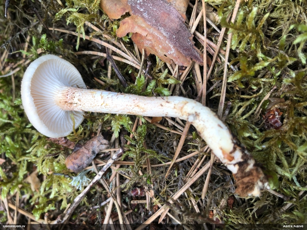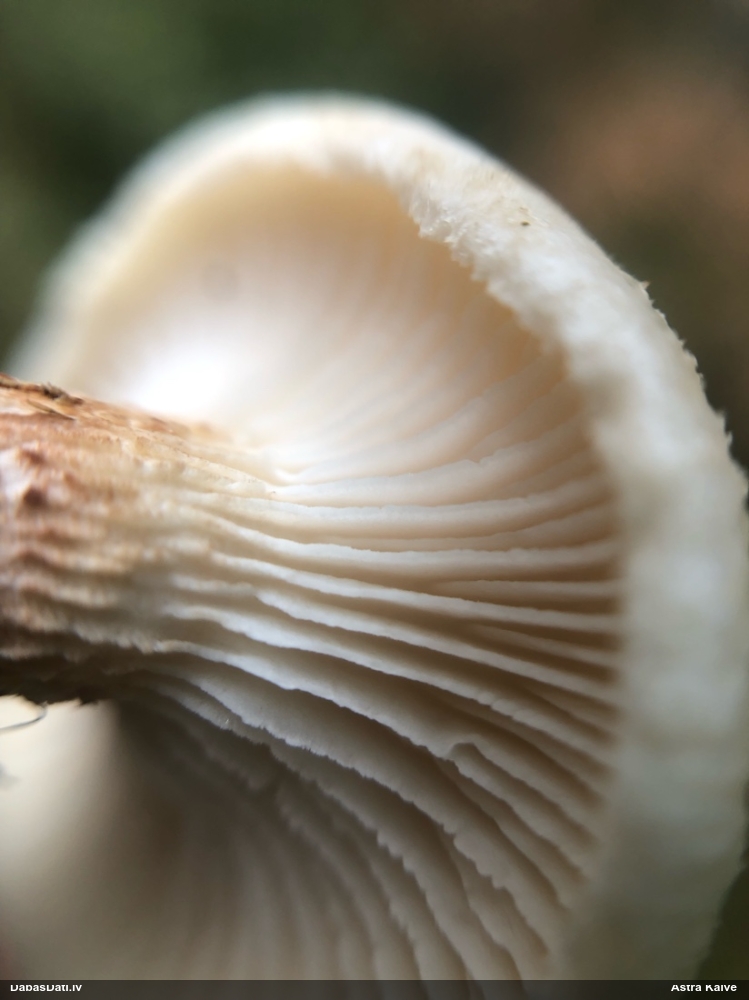 Es teiktu, ka Pleurotus cornucopiae: Cepurītes krāsa tik gaiši bēša nav pat vairākkārt salušām P.osteatus, bet šīs ir svaigi izaugušas. Lapiņas izteikti vērstas uz leju un veido kātiņa apakšā neregulāru rakstu, ko sauc par "anastomozes" tīklu.
