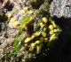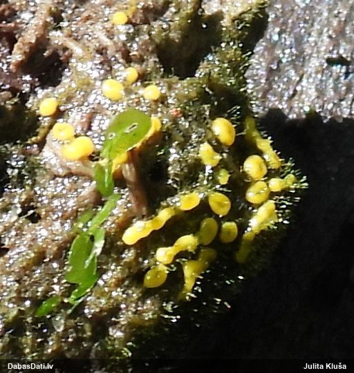 Man pēkšņi radās ideja - vai tur bija nu ļoti mitrs mikroklimats, egle ar melnalksni? Hipotētiski tādas dzeltenas var būt Diachea muscorum. Te bilde ir mazliet līdzīga: https://fr.wikipedia.org/wiki/Fichier:Craterium_muscorum,_Trawscoed,_North_Wales,_Aug_2016_-_Flickr_-_janetgraham84.jpg
