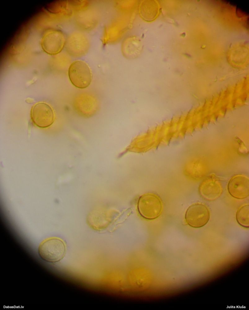Sporas izskatās ļoti gaišas, varbūt nenobriedušas. Es laikam pēc kāda laiciņa mēģinātu vēlreiz mikroskopēt. Tajā pašā laikā sporu izmēri priekš T.contorta ir pamazi (ja tipiski ir 11-14 mkm, te ir knapi 11 mkm)