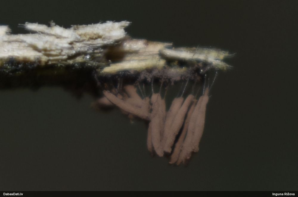 Žēl, ka mikroskopijā neviens kapilīcija mezgls (un vnk pavedieni) nav "aizķēries" (bet varbūt citos foto ir?), jo varētu būt F.licentii. Ovālo sporu gan jau arī netrūkst, kam šādā stadijā varētu arī nepievērst uzmanību un nesamērīt (bet būtu vajadzējis).