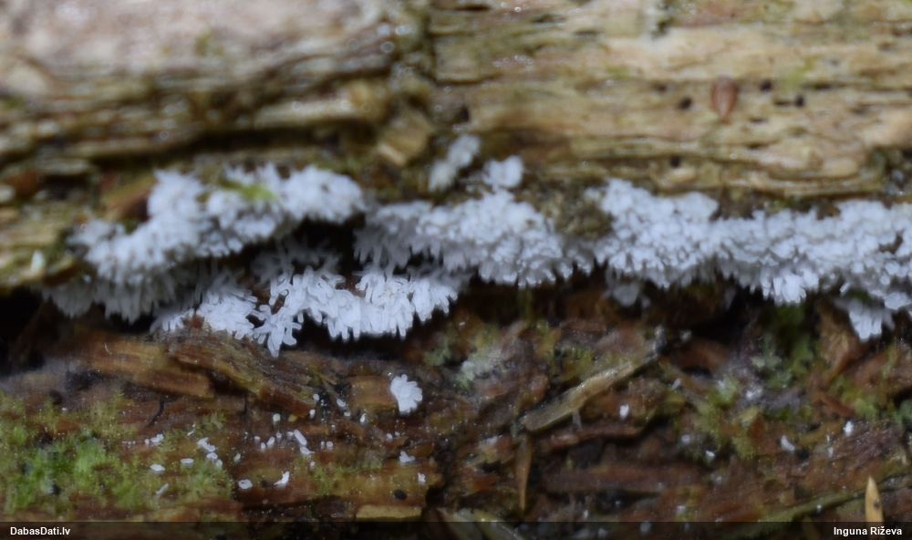 Šim Vijas paraugam iekšas precīzi tādas pašas - baltdzeltenas, ar kapilīciju ar maziem mezgliem, un virsma balta. Sporas gan lielākas: https://dabasdati.lv/lv/observation/b146f03a39b8789e2897007d9e464255/
