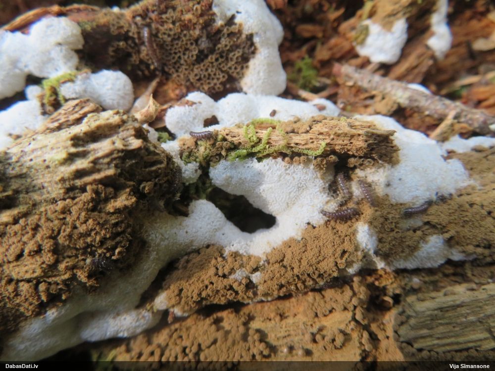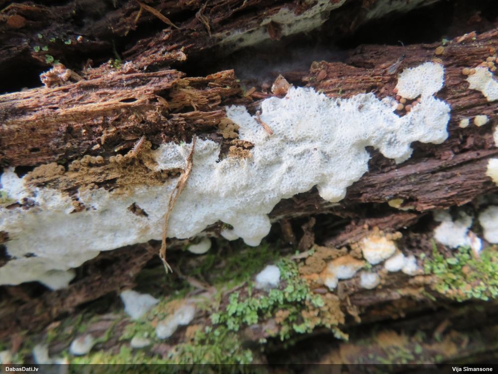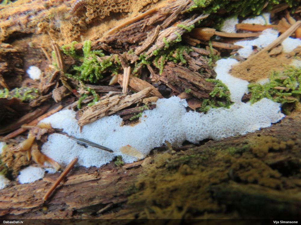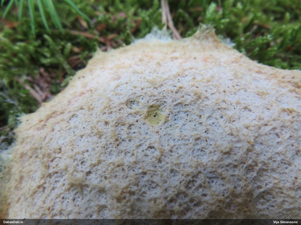 Šim Vijas paraugam iekšas precīzi tādas pašas - baltdzeltenas, ar kapilīciju ar maziem mezgliem, un virsma balta. Sporas gan lielākas: https://dabasdati.lv/lv/observation/b146f03a39b8789e2897007d9e464255/