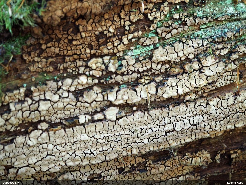 Šim Vijas paraugam iekšas precīzi tādas pašas - baltdzeltenas, ar kapilīciju ar maziem mezgliem, un virsma balta. Sporas gan lielākas: https://dabasdati.lv/lv/observation/b146f03a39b8789e2897007d9e464255/