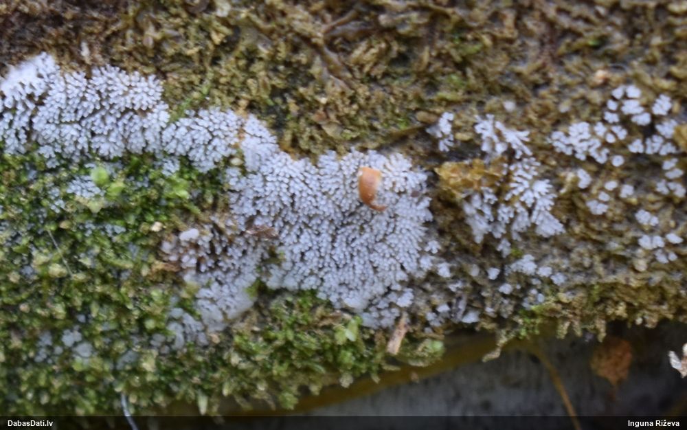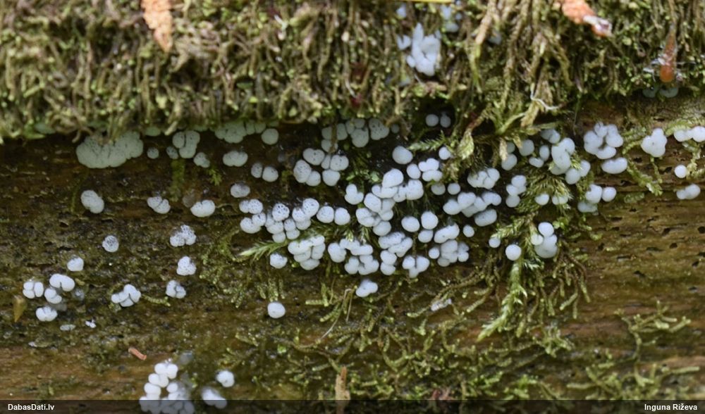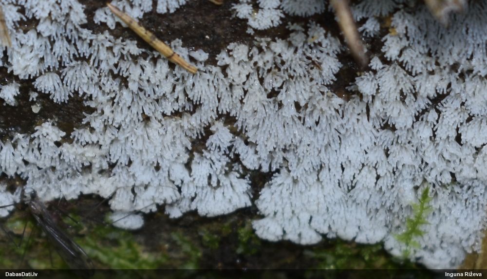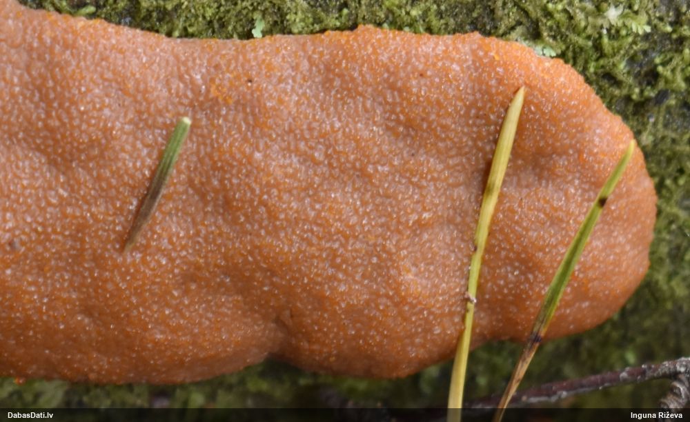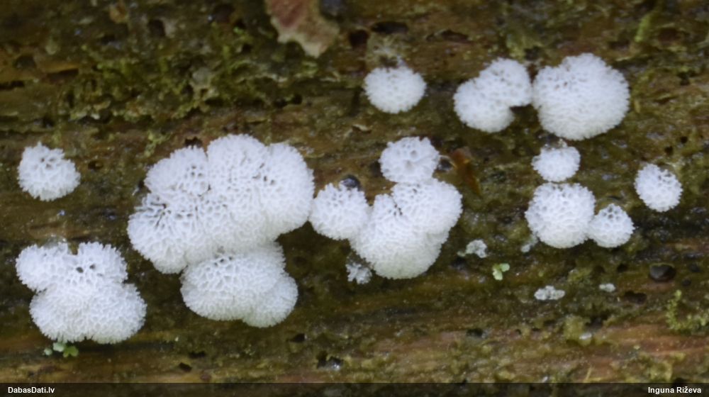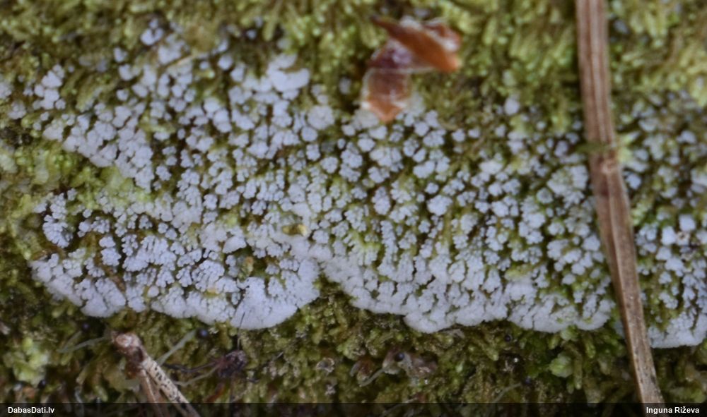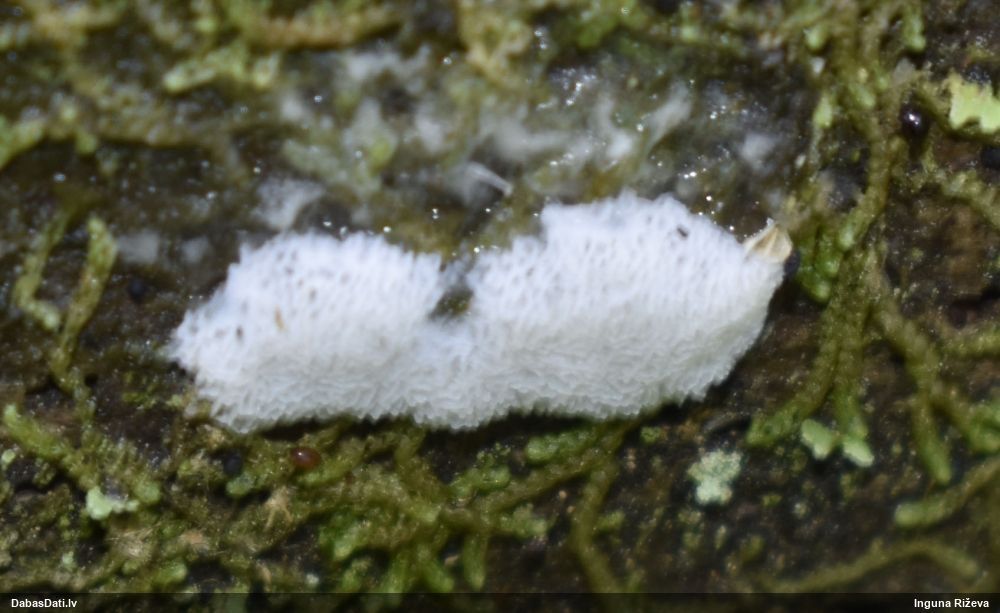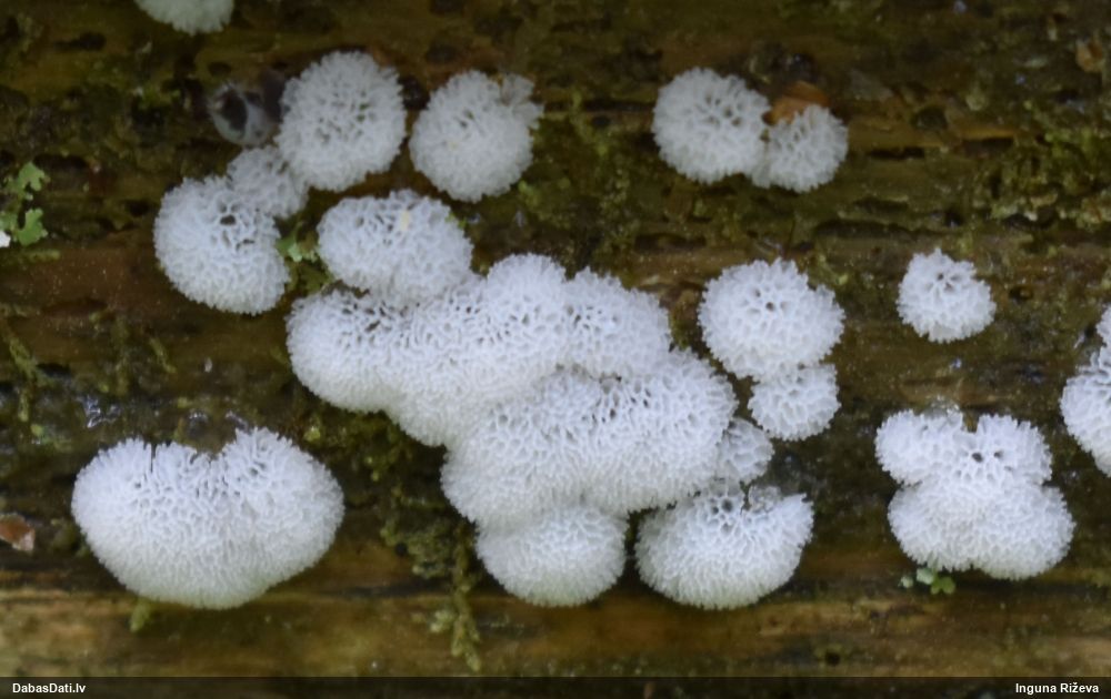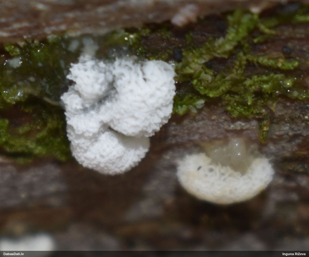 Šim Vijas paraugam iekšas precīzi tādas pašas - baltdzeltenas, ar kapilīciju ar maziem mezgliem, un virsma balta. Sporas gan lielākas: https://dabasdati.lv/lv/observation/b146f03a39b8789e2897007d9e464255/