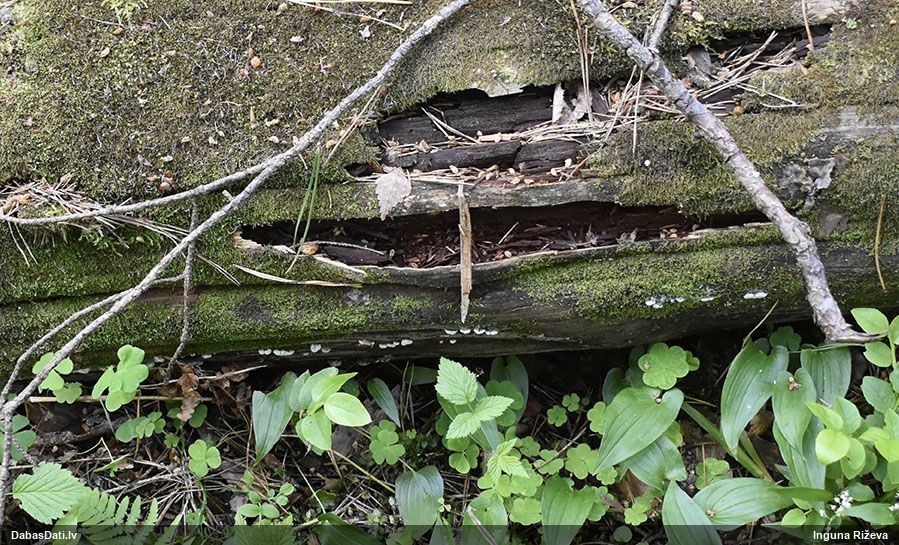 Skujkoks nav par tuvumā. Ir tikai lapu koki - lazda, kastanis, ābelītes. Otrpus celmam (D pusē) lejasdaļā, ko pamanīju pirmo, arī bija kaut kas no šim līdzīga, bet tik izsporojies, ka palicis tikai paliels brūns sporu pleķis. Intriga pavērot nākamgad.