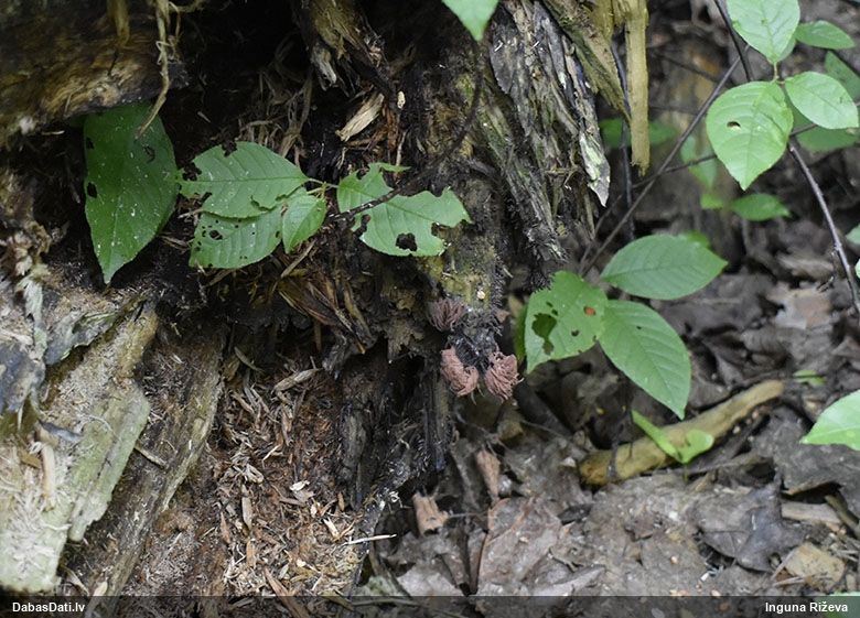 Skujkoks nav par tuvumā. Ir tikai lapu koki - lazda, kastanis, ābelītes. Otrpus celmam (D pusē) lejasdaļā, ko pamanīju pirmo, arī bija kaut kas no šim līdzīga, bet tik izsporojies, ka palicis tikai paliels brūns sporu pleķis. Intriga pavērot nākamgad.