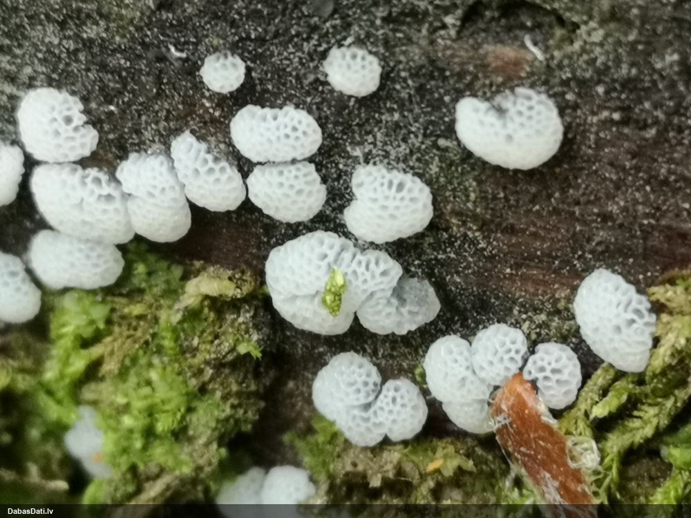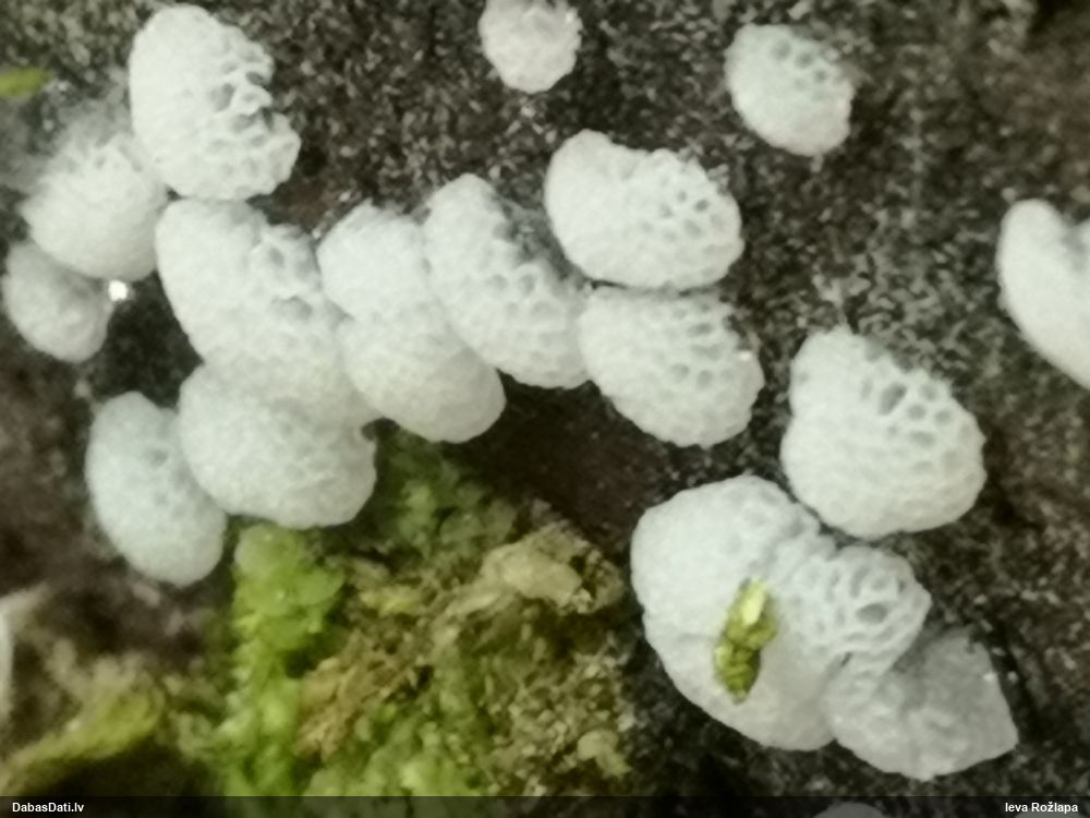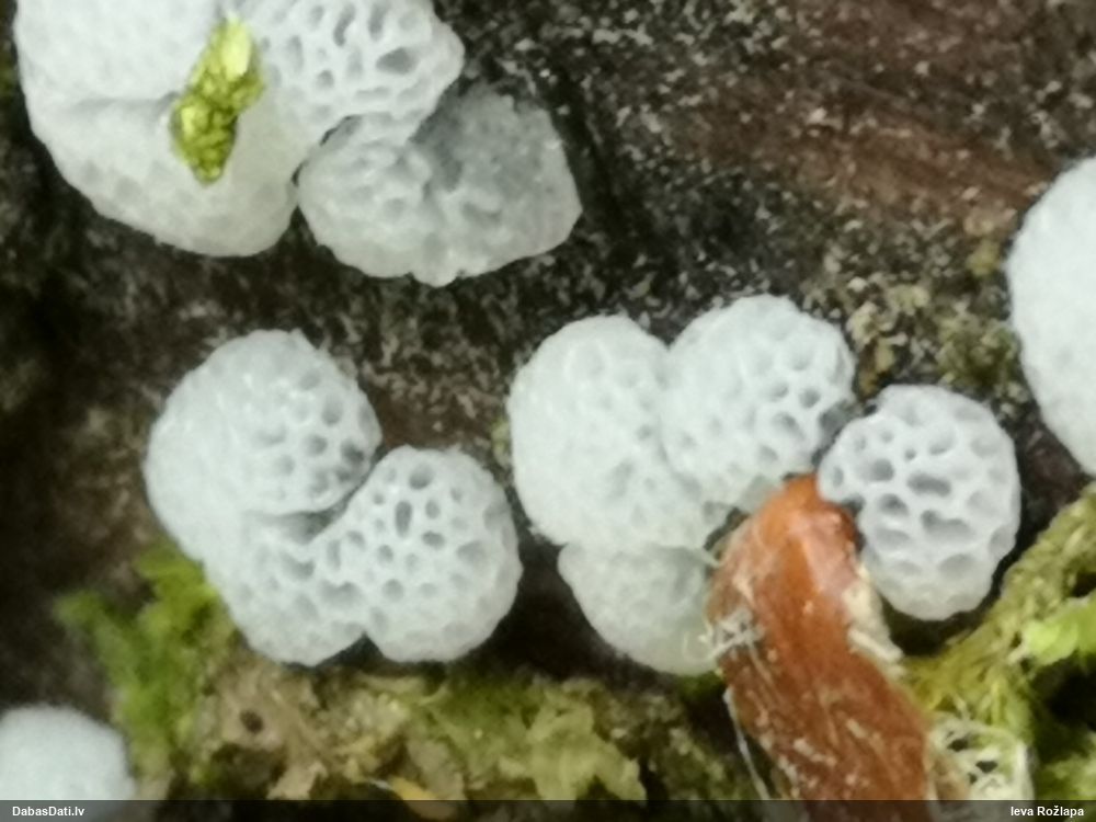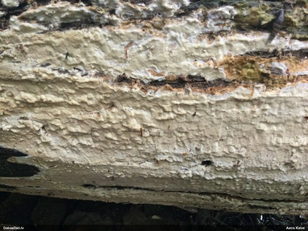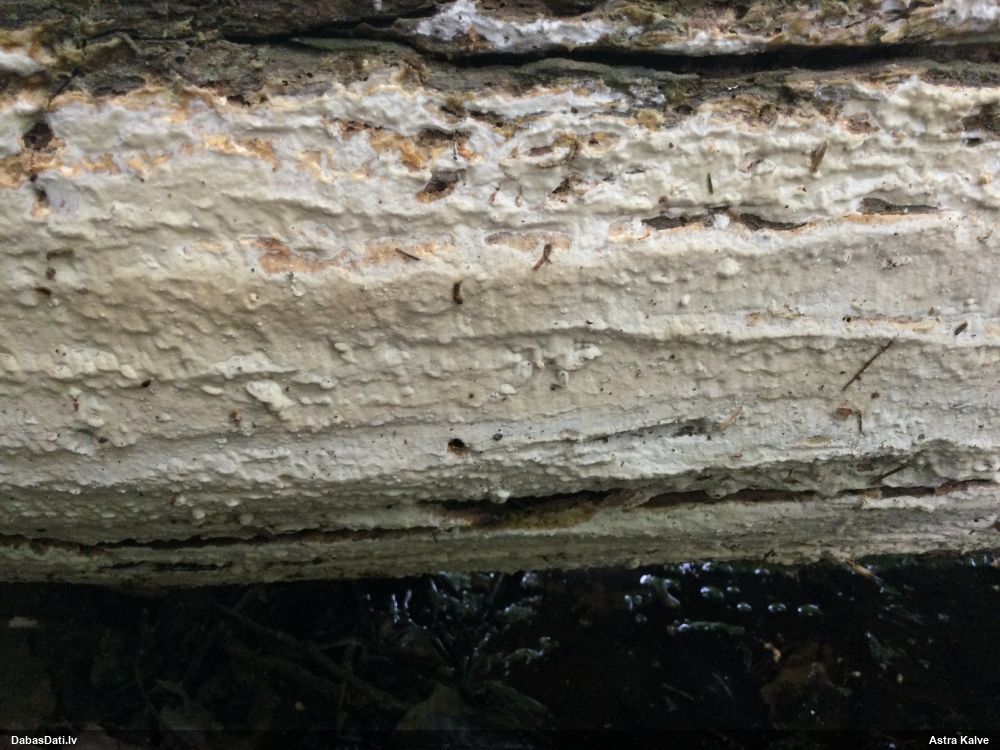 Šim Vijas paraugam iekšas precīzi tādas pašas - baltdzeltenas, ar kapilīciju ar maziem mezgliem, un virsma balta. Sporas gan lielākas: https://dabasdati.lv/lv/observation/b146f03a39b8789e2897007d9e464255/
