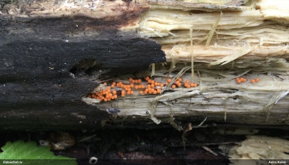 Hmm, nepievērsu tam uzmanību, bet tas interesanti, paldies! Vispār izskatās pēc vālenītes, ne kūlītes, speciāli salīdzināju aprakstus ar Stemonitis splendens, bet mikroskopiski tomēr atbilst visām kūlītes pazīmēm, un abas mikroskopētās kūlītes - vienādas. Tur kāds skujkoks blakus neaug?
