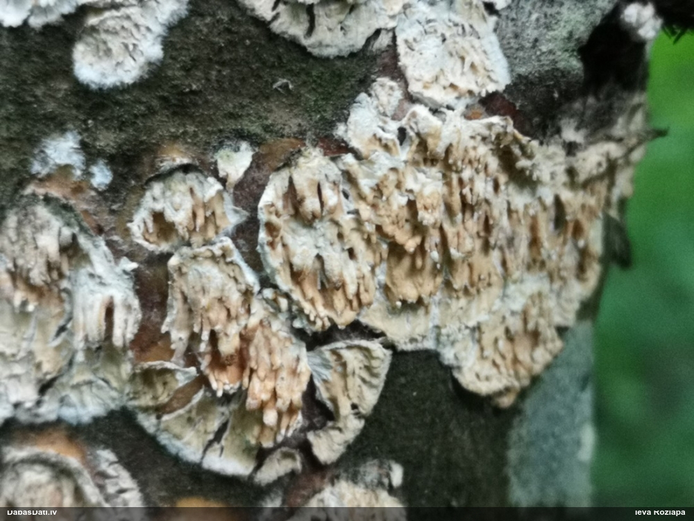 Šim Vijas paraugam iekšas precīzi tādas pašas - baltdzeltenas, ar kapilīciju ar maziem mezgliem, un virsma balta. Sporas gan lielākas: https://dabasdati.lv/lv/observation/b146f03a39b8789e2897007d9e464255/